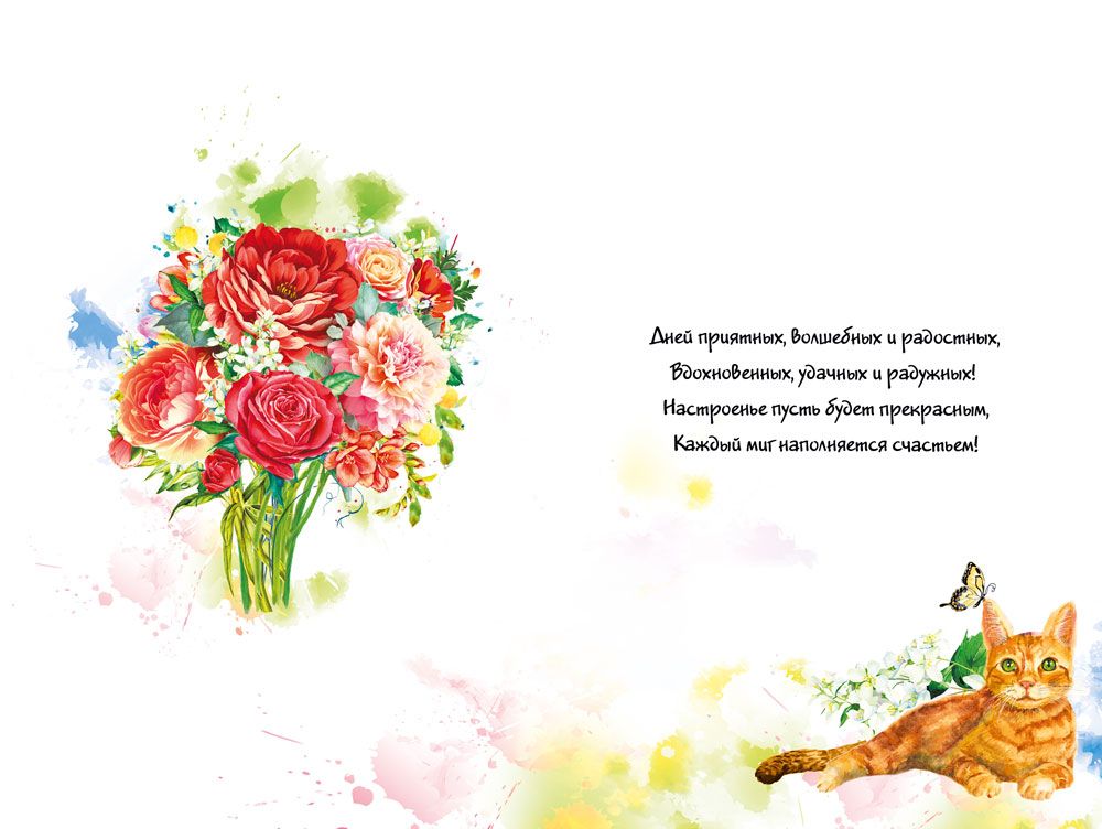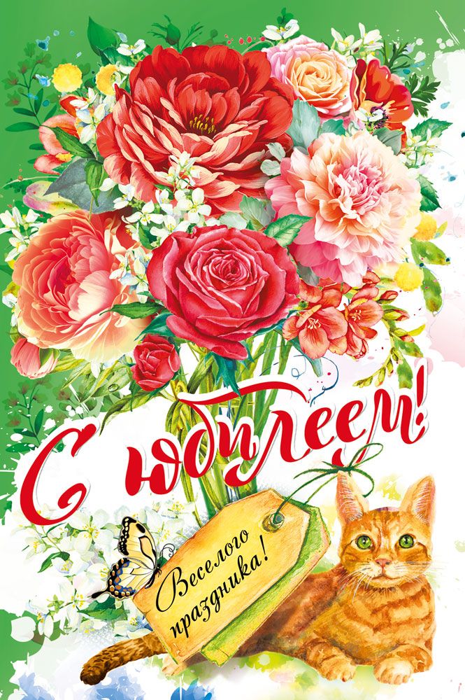 Открытка формата А5 предназначена для поздравления с юбилеем и ориентирована на использование в розничной продаже и оптовых поставках для торговых сетей, сувенирных отделов и корпоративных заказчиков. Изделие изготовлено из плотного картона, что обеспечивает устойчивость к изгибам и истиранию в процессе транспортировки, выкладки и хранения. Лицевая сторона оформлена яркой полноцветной печатью с крупным букетом цветов на насыщенном фоне, дополненным изображением кота, декоративными элементами и надписями «С юбилеем!» и «Весёлого праздника!», что делает открытку универсальной для поздравления взрослых адресатов разного возраста. Поверхность покрыта глянцевым УФ-лаком, за счёт чего изображение имеет выраженную цветопередачу, устойчиво к выцветанию и образованию мелких царапин, удобно для поддержания товарного вида при длительной экспозиции на витрине. Внутри размещён готовый поздравительный текст, позволяющий использовать открытку без дополнительной подготовки, что актуально для розничных покупателей и компаний, формирующих стандартные поздравительные наборы для сотрудников и партнёров. Габариты готового изделия 182 × 122 мм обеспечивают совместимость с типовыми почтовыми конвертами соответствующего формата и удобство при хранении в стандартных кассетах или настольных стойках. Плотный картон сохраняет форму открытки при пересылке и вручении, не деформируется при многократном перелистывании. В упаковке 10 штук, что упрощает планирование и учёт при оптовых закупках, формировании ассортимента по тематикам праздников и размещении на полке по фронтам. Открытка подходит для использования как самостоятельный элемент поздравления либо в дополнение к подарку, может применяться в корпоративных наборах, праздничных рассылках и розничных подарочных комплектах.