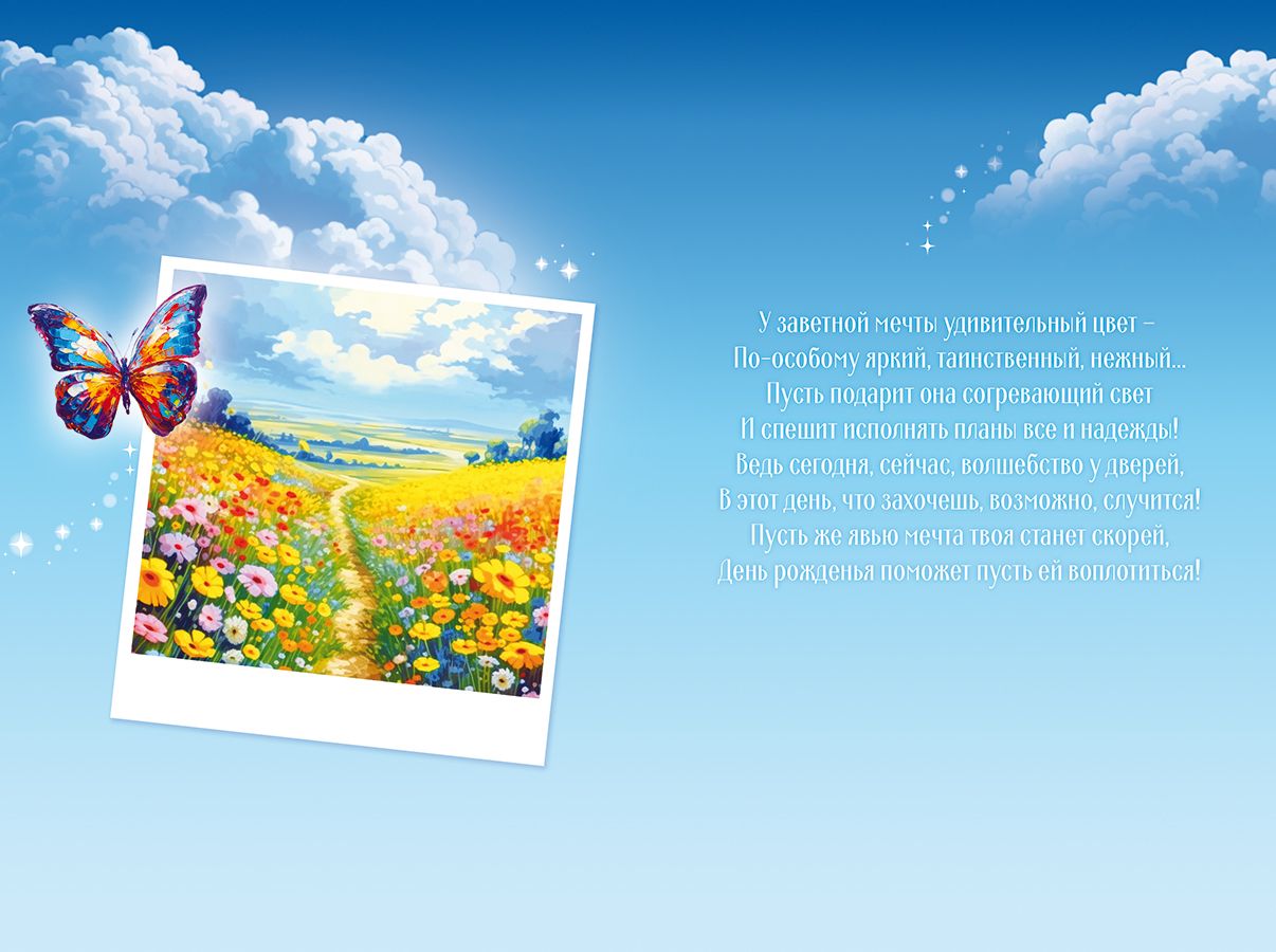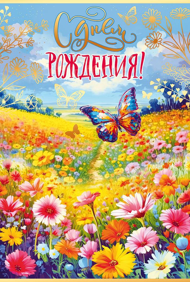 Открытка формата А5 «С Днём рождения» выполнена из плотного картона, обеспечивающего жесткость изделия и устойчивость к деформациям при хранении и транспортировке в стандартных коробах и почтовых отправлениях. Готовый размер открытки 182 × 122 мм позволяет использовать её как универсальный вариант для розничной выкладки на полках и подвесных стендах, а также удобно комбинировать с конвертами соответствующего формата в оптовых партиях. Лицевая сторона оформлена полноцветным изображением цветущего летнего поля с крупными яркими цветами и разноцветной бабочкой на переднем плане; композиция дополнена декоративными элементами в виде контуров цветов и бабочек, частично выделенных золотой фольгой. Применение фольги золотой повышает износостойкость ключевых элементов дизайна, придаёт изображению выраженный блеск и улучшает читаемость надписи «С Днём рождения!» при различном освещении, что важно для выкладки в торговом зале и витринного оформления. Внутри открытки расположен готовый поздравительный текст, что сокращает время обслуживания в рознице и упрощает выбор конечному покупателю: изделие не требует дополнительного оформления, при необходимости остаётся место для краткого личного обращения. Плотный картон сохраняет форму при многократном перелистывании, не расслаивается по линии сгиба и совместим с распространёнными видами шариковых и гелевых ручек, чернила не растекаются и не просвечивают на лицевую сторону. Нейтральная, яркая, но не тематически ограниченная цветочная тематика делает открытку подходящей для широкого круга получателей и возрастов, что удобно при формировании базового ассортимента для магазинов подарков, книжных сетей и неспециализированной розницы. Компактный формат и стандартные пропорции облегчают хранение крупного запаса товара на складе и в подсобных помещениях, а также позволяют рационально использовать торговое пространство. В упаковке 10 штук, что удобно для учета, планирования закупок и пополнения полочного запаса без излишков.