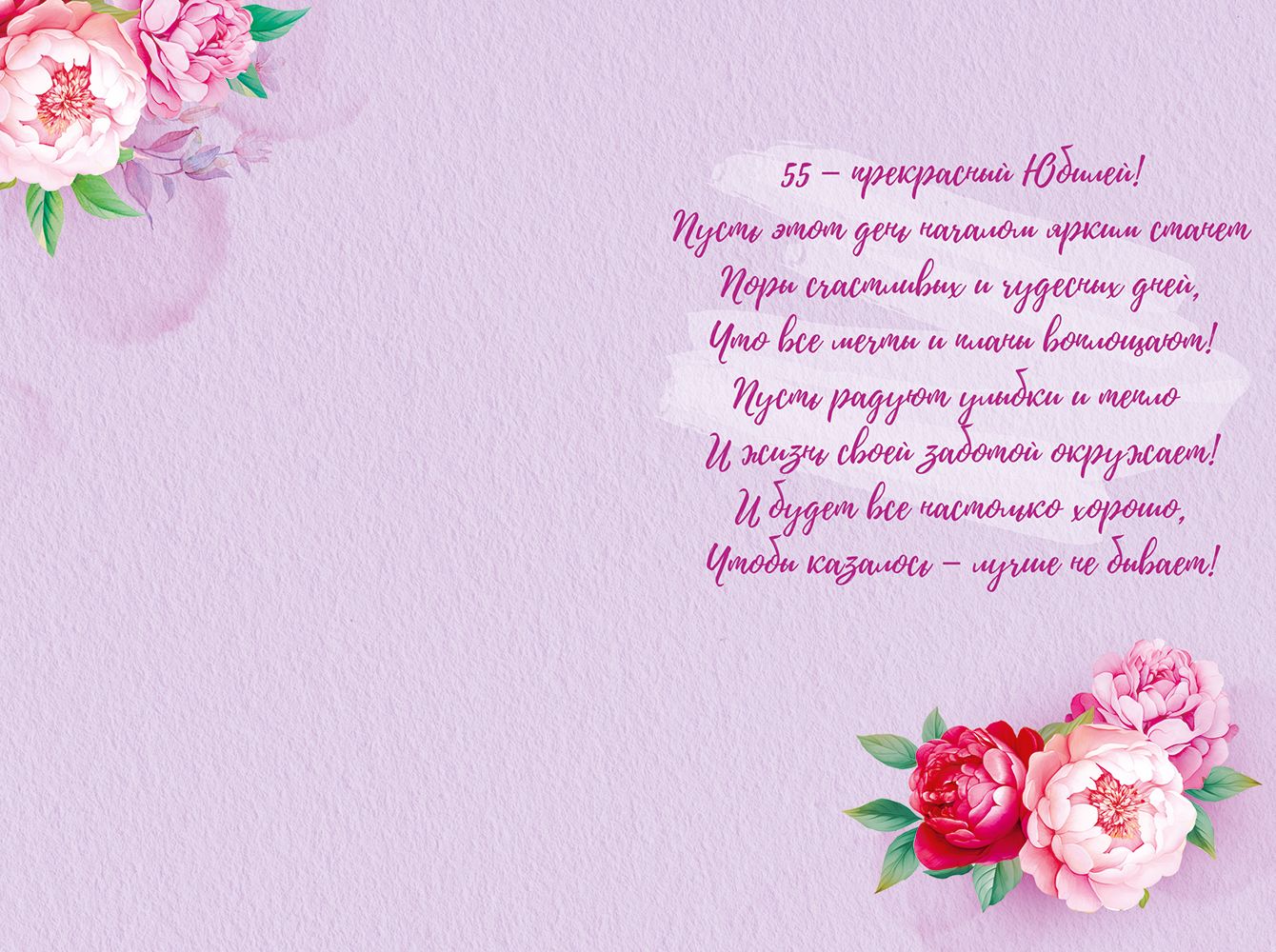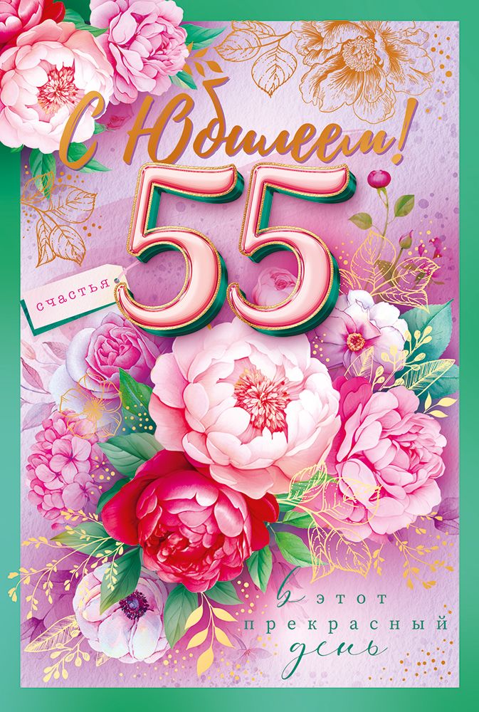 Открытка формата А5 предназначена для поздравления с юбилеем 55 лет и ориентирована на использование в розничной продаже и в составе ассортимента для оптовых закупок. Изделие изготовлено из плотного картона, что обеспечивает стабильную геометрию при хранении и транспортировке, а также устойчивость к изгибам и истиранию в торговом обороте. Лицевая сторона оформлена крупной надписью «С Юбилеем! 55» и декоративной композицией из пионов и листьев на розово‑фиолетовом фоне, дополненной золотой фольгой, за счёт чего отдельные элементы рисунка и надписей имеют металлизированный блеск и хорошо читаются при разном освещении. Внутри предусмотрен заранее напечатанный поздравительный текст, позволяющий использовать открытку без дополнительной подготовки, что удобно как для конечного покупателя, так и для торговых точек с высоким потоком клиентов. Габариты готового изделия: длина 182 мм, ширина 122 мм, что соответствует стандартному формату для размещения в типовых витринах, настольных и напольных стойках, а также в почтовых конвертах соответствующего размера. Плотный картон позволяет сохранять первоначальный вид при многократном перелистывании и выкладке, не деформируется в стопках и коробах, что важно при оптовых поставках. Отделка золотой фольгой наносится локально и не отслаивается при аккуратном использовании, поверхность устойчива к легким касаниям и кратковременному контакту с влагой, не теряет цвет при обычном искусственном освещении. Открытка подходит для поздравления женщин и мужчин, может использоваться как самостоятельный знак внимания или в дополнение к подарку, гармонично смотрится в цветочных композициях и подарочных наборах. В упаковке 10 штук, что удобно для формирования линейки юбилейных товаров, планирования складских остатков и поддержания единообразного ассортимента в торговом зале.