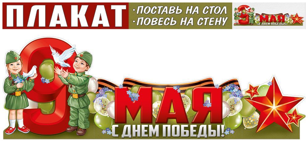 Плакат-полоска «9 Мая. С Днём Победы» представляет собой фигурно вырубленное декоративное изделие из плотного картона, предназначенное для оформления интерьеров к праздничным мероприятиям, приуроченным ко Дню Победы. Готовое изделие имеет длину 993 мм и ширину 337 мм, что позволяет использовать его как настенное или настольное украшение в помещениях различной площади: в классах и актовых залах образовательных учреждений, офисах, торговых зонах, холлах административных зданий, а также в домашних интерьерах. Композиция плаката включает крупную надпись «9 Мая. С Днём Победы!» на фоне воздушных шаров и георгиевской ленты, изображения детей в военной форме и декоративных красных звёзд, что обеспечивает узнаваемую праздничную символику и визуально заполняет горизонтальное пространство без необходимости дополнительного декора. Материал изготовления — картон с полноцветной печатью, подобранный для сохранения формы при горизонтальном размещении и устойчивости к небольшим механическим воздействиям при транспортировке и многократном использовании. Отделка без дополнительных декоративных эффектов упрощает хранение в стопках и минимизирует риск повреждения поверхности при оптовой логистике и складском учёте. Плакат рассчитан на использование в качестве готового решения: достаточно закрепить его на стене, дверном полотне, витрине, ширме или установить на горизонтальную поверхность с опорой. Формат длиной до 1 м удобен для размещения над доской, входной группой или вдоль стеллажей, при этом изделие помещается в стандартную транспортную упаковку и не требует специального оборудования для перевозки. Плакат поставляется по 1 в упаковке, что облегчает точный расчёт тиражей при оптовых закупках под конкретные мероприятия, а для розничного покупателя позволяет приобрести нужное количество изделий под оформление отдельного кабинета, класса или комнаты без избыточных остатков.