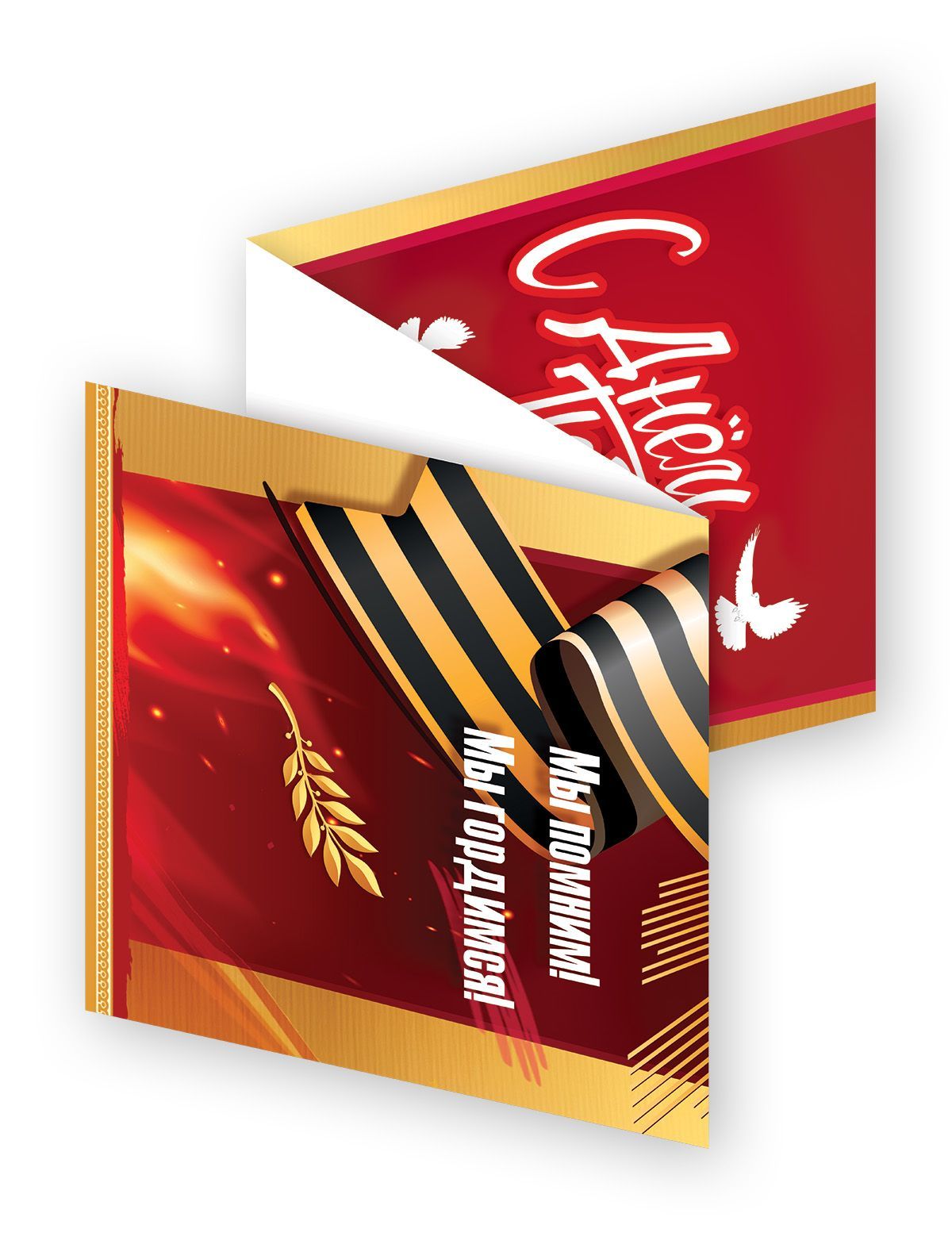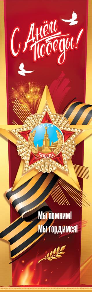 Плакат-полоска «С Днём Победы! Мы помним! Мы гордимся! (орден, георгиевская лента, голуби, салют, ветвь)