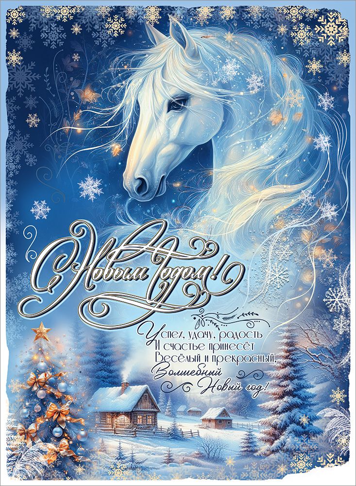 Плакат формата А2 представляет собой полноцветное новогоднее оформление на картоне с вертикальной компоновкой и точными размерами готового изделия 600 × 440 мм, что удобно для планирования выкладки и размещения в торговых и офисных помещениях. Плотный картон обеспечивает достаточную жёсткость, за счёт чего плакат сохраняет форму при креплении на стену, дверь, витрину или информационный стенд, а также устойчив к многократному использованию в течение нескольких сезонов при аккуратном обращении. Изображение выполнено в холодной зимней гамме с крупной центральной композицией: белый конь на фоне ночного неба, снежинки, заснеженный деревенский пейзаж с домами и новогодней ёлкой, украшенной шарами и бантами. В центре размещена надпись «С Новым годом!», дополненная поздравительным текстом, что позволяет использовать изделие одновременно как декоративный элемент и как готовое текстовое поздравление для посетителей, сотрудников или гостей. Плакат поставляется в количестве 10, что удобно для оптовых закупок, равномерного оформления сети торговых точек, офисных помещений, учебных заведений, холлов и зон ожидания. Ровные края и отсутствие дополнительной отделки упрощают хранение в стопе, упаковку и транспортировку без риска зацепов и повреждения соседних изделий, а также позволяют при необходимости ламинировать или помещать плакат в стандартные рамки и панели. Картонная основа совместима с большинством распространённых способов крепления: скотч, клеевые точки, кнопки, тонкие гвозди, магнитные и клипсовые системы. Для розничного покупателя плакат может использоваться для оформления гостиной, детской комнаты, входной зоны частного дома, школьного класса или кабинета, создавая единый тематический новогодний акцент. Оптимальный размер позволяет хорошо считывать текст и изображение с расстояния, при этом плакат не требует большого пространства на стене и может комбинироваться с другими элементами декора в единой композиции.