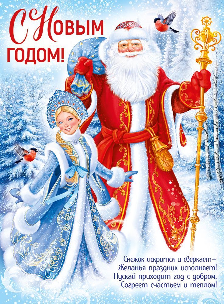 Плакат новогодний формата А2 выполнен из плотного картона с полноцветной печатью по всей площади лицевой стороны. Габаритные размеры готового изделия – 600 × 440 мм, что обеспечивает хорошую видимость изображения и текста в помещении среднего и большого размера. На плакате изображены Дед Мороз и Снегурочка на зимнем фоне с лесом и снегом, в верхней части размещена крупная надпись «С Новым годом!», в нижней части – новогоднее поздравление в стихотворной форме. Композиция ориентирована вертикально, текст и графика читаются с расстояния, удобного для размещения в торговых залах, офисах, образовательных учреждениях и жилых интерьерах. Картонная основа обеспечивает достаточную жесткость для крепления на стену, дверь, витрину или перегородку без дополнительного усиления; изделие сохраняет форму при кратковременных перепадах влажности и температуры в отапливаемых помещениях. Печать устойчива к выцветанию при стандартном искусственном освещении, что позволяет использовать плакат в течение всего праздничного сезона и закладывать его в повторные новогодние оформления. Поверхность без отделки облегчает маркировку и инвентаризацию, не создает бликов под ярким светом, что важно при размещении в витринах и на стендах. Изделие удобно для транспортировки и складского хранения: плакат можно хранить в плоском виде или аккуратно скручивать в рулон, при соблюдении базовых условий хранения не образуются заломы, влияющие на читаемость текста. Универсальный новогодний сюжет подходит для оформления магазинов, детских учреждений, приемных, холлов, а также для домашнего декора, создания тематических фотозон и сопровождения новогодних мероприятий. В упаковке – 10 плакатов, что позволяет планировать закупку для сетевого и сезонного оформления с единым визуальным стилем на нескольких площадках.