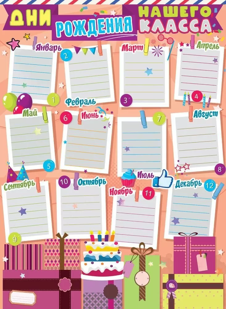Плакат «Дни рождения нашего класса» в формате А2 станет чудесным украшением в школе и преобразит любой интерьер. Прочный картон и четкая печать делают изделие качественным, ярким, долговечным и безопасным для детей. Симпатичный дизайн с красочными иллюстрациями придает плакату привлекательный и праздничный вид! Такой плакат можно повесить на стену, мебель при помощи скотча или прикрепить к доске магнитами. Для каждого месяца в году есть специально отведенное место, где можно указать фамилии именинников: это послужит одновременно напоминанием о важных датах и оригинальным декором для класса.
