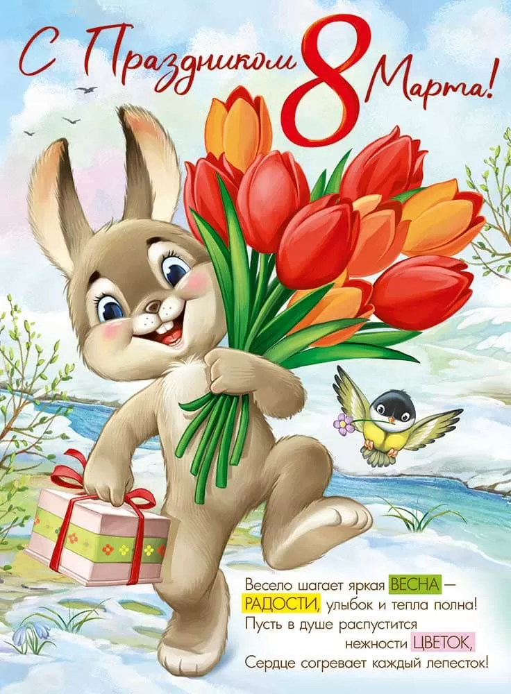 Односторонний плакат-постер с изображением зайчика с подарком и букетом ярких тюльпанов для подготовки к наступлению Весны и 8 Марта. Может использоваться в качестве настенного украшения или декорации к выступлению.