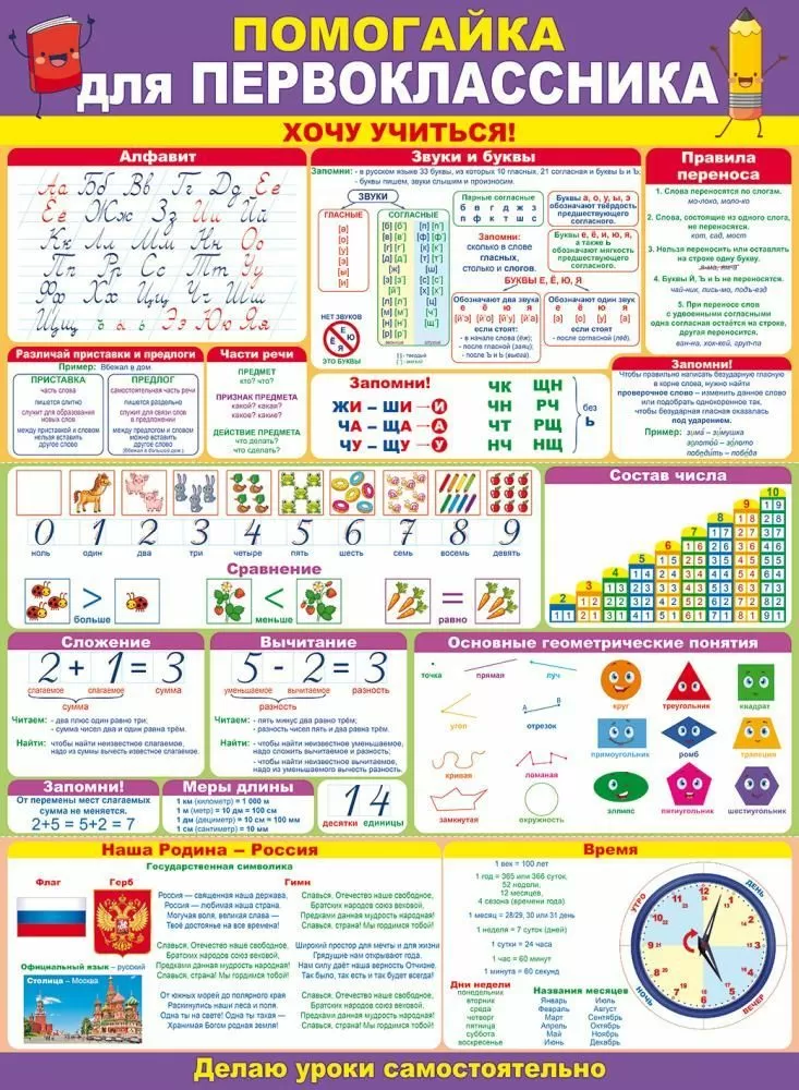 Красочный плакат, который поможет первокласснику в учебе. В нем собраны основные правила и формулы. Такой плакат – это замечательный способ с пользой украсить интерьер. Нужная информация всегда будет перед глазами, а значит, первоклассник быстро выучит алфавит, разберется с составом числа, познакомится со временем и т.д. Кроме того плакат станет помощником в подготовке домашнего задания.