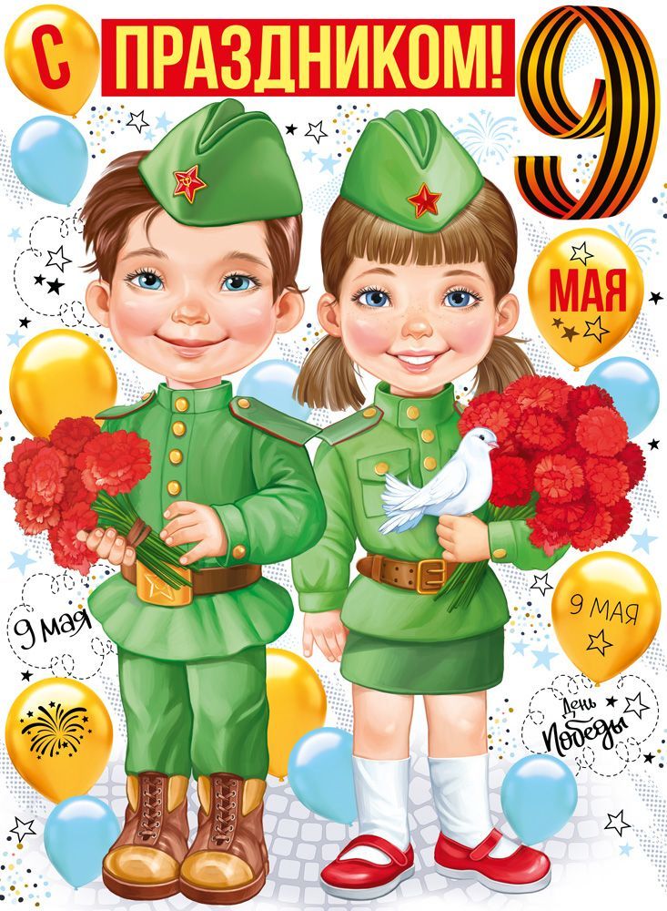 Плакат «С праздником 9 Мая!» (дети в форме с букетами)