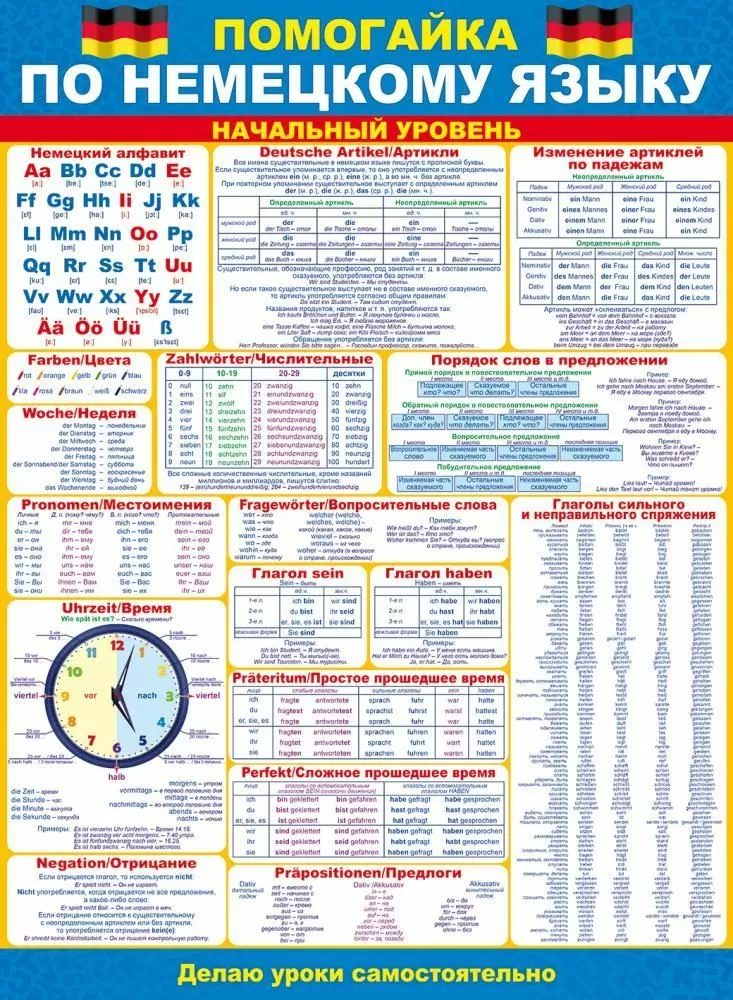 Красочный плакат из серии «Помогайка» c основными знаниями по немецкому языку поможет ребенку в учебе. Такой плакат – это замечательный способ с пользой украсить интерьер. Нужная информация всегда будет перед глазами, это значительно облегчит запоминание. Кроме того, плакат станет отличным помощником в подготовке домашнего задания – к нему всегда можно обратиться, чтобы лучше разобраться в предмете!