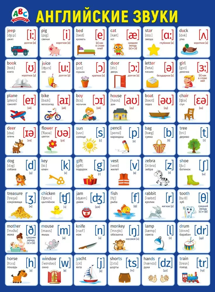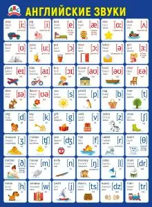 Плакат «Английские звуки» помогает научиться правильно произносить английские буквы и их сочетания в словах. Постер разделён на отдельные карточки, на каждой карточке даётся звук или сочетание звуков, их произношение в английской транскрипции, слово-пример с переводом на русский язык и яркая иллюстрация. Глядя на карточку, ученик сразу визуально связывает картинку и соответствующее ей английское слово в единое целое. Таким образом включается ассоциативная связь между словом и рисунком, что облегчает запоминание, и процесс обучения становится более быстрым и эффективным.