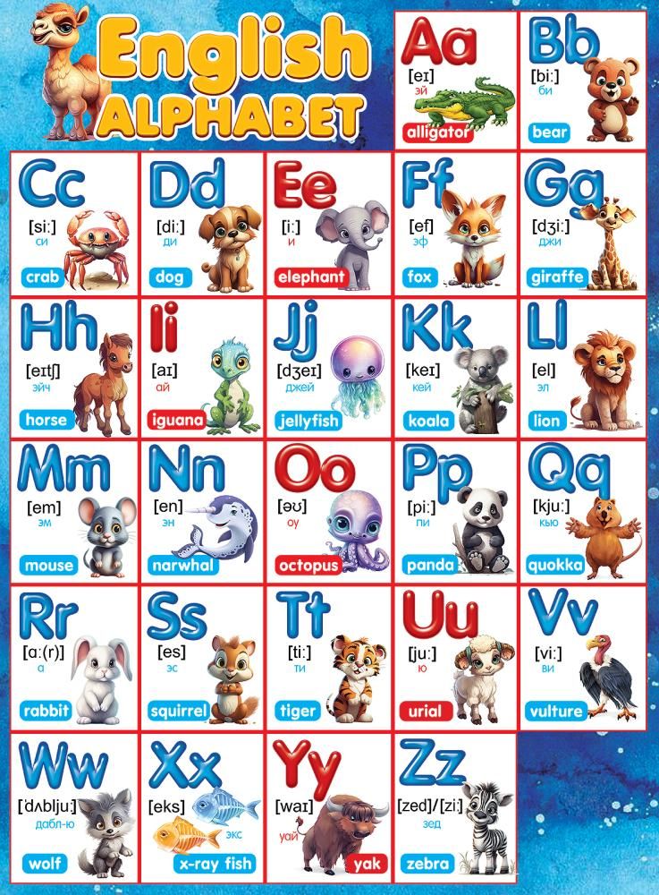 Плакат формата А2 представляет собой обучающее наглядное пособие по английскому алфавиту с текстовой информацией. Изделие изготовлено из плотного картона, что обеспечивает достаточную жесткость, устойчивость к изгибам и сохранение геометрии при длительном использовании в учебных помещениях и детских зонах. Размер готового изделия 600 × 440 мм позволяет размещать плакат на стандартных школьных и офисных стендах, магнитных досках и в интерьерах детских комнат без дополнительной подрезки или подгонки. Поверхность без отделки удобна для чтения при любом освещении, не дает бликов и подходит для размещения под прозрачными стендами или в простых рамках. На плакате представлены все буквы английского алфавита с четким делением на заглавные и строчные, сопровожденные транскрипцией и подписью английских слов с иллюстрациями животных, что облегчает визуальное восприятие и запоминание. Текст выполнен крупным шрифтом с контрастными цветами, обеспечивающими хорошую читаемость с расстояния, что важно при использовании в классах и группах. Плотный картон выдерживает многократную транспортировку и частую смену места размещения, плакат можно хранить в горизонтальном или вертикальном положении, в папках и тубусах стандартного размера. Изделие подходит для комплектации учебных кабинетов, детских садов, развивающих центров и языковых школ, а также для домашнего использования при индивидуальных занятиях с детьми дошкольного и младшего школьного возраста. Конструкция плаката совместима с типовыми системами крепления: его можно фиксировать на стене кнопками, скотчем, зажимами или в подвесных рамках. Набор в упаковке — 10, что удобно для оптовых закупок при оснащении нескольких аудиторий, формировании учебных наборов или последующей розничной реализации поштучно.