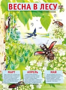 Весна в лесу — время пробуждения природы, перемен и первых теплых лучей солнца. Этот красочный плакат представляет атмосферу живого леса, наполненного звуками птиц, шелестом листьев и движением насекомых. В центре — сочная зелень, первые цветы и залитая солнцем река, вдоль которой вьются ласточки. Среди деревьев прячутся дятлы и соловьи, оживляя лесной пейзаж своими трелями. В траве заметны майские жуки и жук-олень, которые появляются с приходом тепла. В нижней части плаката от производителя представлена информация о каждом весеннем месяце.