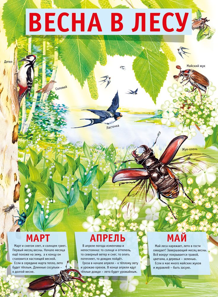 Плакат формата А2 «Весна в лесу» выполнен из плотного картона и рассчитан на интенсивное использование в учебных и демонстрационных целях. Размер готового изделия 600 × 440 мм обеспечивает хорошую читаемость иллюстраций и текстовых блоков с расстояния, что удобно при фронтальной работе в классе, группе или на тематических занятиях. Картонная основа сохраняет форму, не коробится и устойчива к многократному вывешиванию на стенды, рейки, магнитные и пробковые доски, а также к частым перемещениям между кабинетами; изделие удобно транспортировать в стандартных папках и тубусах формата А2. На лицевой стороне размещена цветная иллюстрация весеннего леса с детально прорисованными растениями и животными, подписями к основным видам (птицы, насекомые) и крупным заголовком, что облегчает визуальное восприятие и запоминание. В нижней части плаката представлены три содержательных блока «Март», «Апрель», «Май» с кратким описанием характерных природных явлений, что позволяет использовать изделие как наглядное пособие по сезонным изменениям в природе, развитию речи и окружающему миру в дошкольных и начальных образовательных программах. Плакат подходит для комплектации тематических серий по временам года, легко сочетается с другими наглядными материалами аналогичного формата и не требует дополнительной отделки или ламинации при аккуратной эксплуатации в помещении. Упаковка содержит 10 изделий, что удобно для оптовых закупок в образовательные учреждения, сети магазинов канцелярии и развивающих товаров, а также для формирования единообразного визуального оформления классов, групп и детских зон. В розничном использовании плакат может применяться для оформления детской комнаты, домашнего учебного уголка или сезонных стендов, обеспечивая наглядное и структурированное представление о весенних изменениях в лесу.