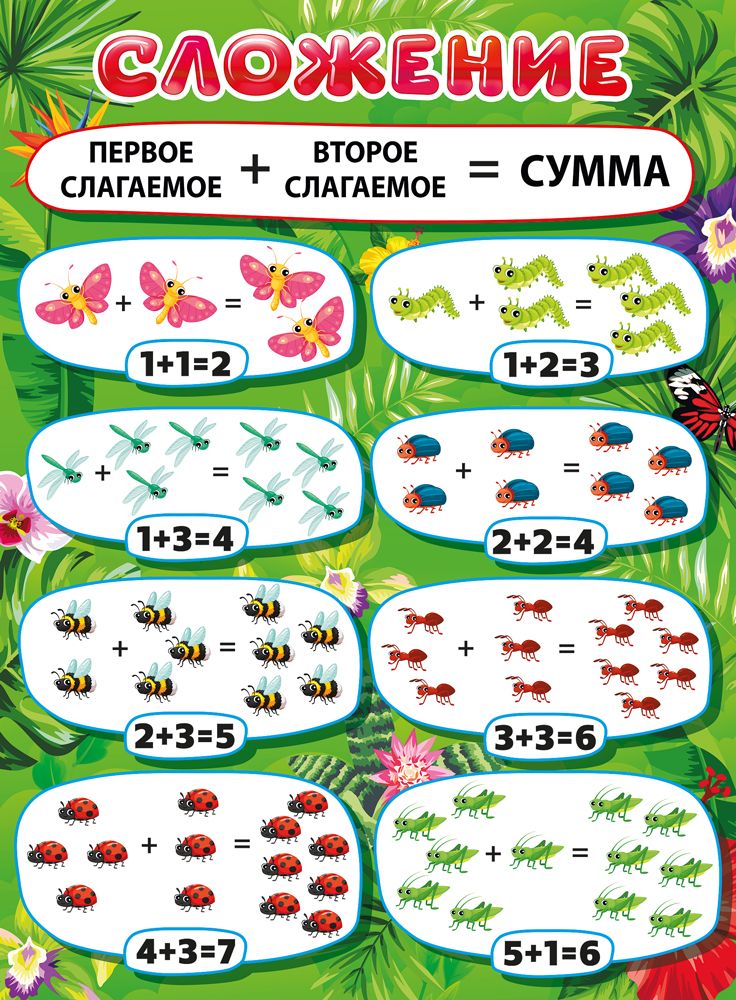 Плакат обучающий «Сложение» формата А2 предназначен для использования в детских образовательных учреждениях, развивающих центрах и домашних условиях как наглядное пособие по освоению начальных математических действий. Изделие выполнено из плотного картона, что обеспечивает устойчивость к изгибам, сохранение формы и минимизацию повреждений при частом использовании, перемещении между кабинетами и многократном размещении на стендах или магнитно-демонстрационных досках. Размер 600 × 440 мм позволяет хорошо считывать информацию с расстояния, что удобно при фронтальной работе с группой детей. Поверхность плаката матовая, без дополнительной отделки, поэтому не даёт бликов под искусственным освещением и сохраняет читаемость иллюстраций в классных помещениях и игровых комнатах. На лицевой стороне представлена наглядная схема сложения: первое слагаемое, второе слагаемое и сумма, дополненная примерами с изображениями насекомых и простыми примерами вида 1+1=2, 1+2=3, 1+3=4, 2+2=4, 2+3=5, 3+3=6, 4+3=7, 5+1=6. Крупные цветные рисунки и чёткие цифровые обозначения помогают формировать у детей ассоциативное восприятие счёта, закреплять состав числа и логику арифметического действия. Плакат может использоваться как основное демонстрационное пособие при объяснении темы, как опорный материал при устном счёте, а также как элемент оформления тематического уголка математики. Картонная основа удобна для крепления на стену кнопками, скотчем или подвесными системами, при этом изделие сохраняет геометрию без провисаний. Компактный плоский формат облегчает хранение в папках и шкафах методических материалов и оптимизирует складскую логистику при оптовых поставках. Упаковка по 10 штук позволяет формировать единый стиль оформления сразу нескольких помещений, кабинетов или групп, а также планировать закупки для сетевых и муниципальных учреждений с учётом стандартизации учебной среды. Плакат подходит для длительного использования в течение нескольких учебных лет при соблюдении базовых условий эксплуатации в помещении.