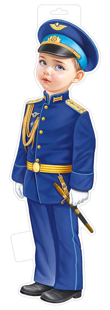 Вырубной плакат формата А3 выполнен из плотного картона с фигурной вырубкой по контуру изображения и двусторонней печатью. На плакате изображён ребёнок в парадной форме в синем мундире с фуражкой, аксельбантом, ремнём и декоративной саблей в ножнах; рисунок детально прорисован, что делает изделие заметным в оформлении интерьеров. Длина готового изделия составляет 542 мм, ширина 166 мм, габариты выдержаны с учётом удобства размещения на дверях, стенах, витринах и в ограниченных по площади зонах декора. Плакат поставляется по 10 штук в упаковке, что удобно при формировании оптовых заказов для сетевых магазинов, праздничных агентств, детских учреждений и организаторов тематических мероприятий. Картонная основа обеспечивает достаточную жёсткость, плакат хорошо держит форму при вертикальном размещении, устойчив к кратковременному изгибу и сохраняет внешний вид при аккуратной транспортировке и многократном использовании в сезонных экспозициях. Двустороннее изображение позволяет использовать изделие в подвесных инсталляциях, при оформлении витрин и залов, где плакат просматривается с двух сторон. Конструкция с фигурной вырубкой даёт возможность применять плакат как самостоятельный элемент декора или в составе композиции с другими носителями аналогичного формата. Отсутствие текста внутри делает изделие универсальным: оно подходит для оформления детских праздников, тематических уроков, патриотических мероприятий, фотозон и игровых пространств, не привязано к конкретной дате и может использоваться многократно в разных сценариях. Размеры плаката оптимальны для стандартных стеллажей и коробов, что упрощает хранение на складе и логистику при крупнооптовых поставках.
