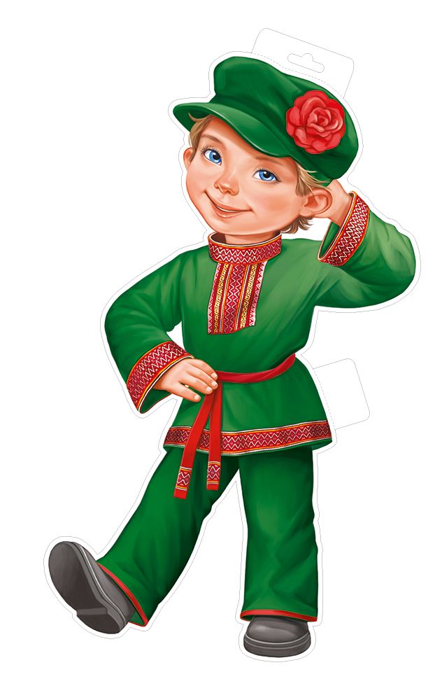 Вырубной плакат формата А3 выполнен из плотного картона с фигурной вырубкой по контуру персонажа — мальчика в национальном костюме в зелёных тонах с декоративными красными элементами. Двустороннее изображение обеспечивает одинаково аккуратный вид при размещении как на стене, так и в подвешенном состоянии посередине помещения, что удобно при оформлении залов, витрин, детских групп и тематических зон. Готовое изделие имеет длину 516 мм и ширину 307 мм, размеры подобраны для хорошей читаемости изображения с расстояния и при этом позволяют рационально использовать площадь экспозиции и упаковки при оптовых поставках. Плакат не содержит текстовых надписей, за счёт чего подходит для использования в учреждениях с различными языковыми требованиями и легко комбинируется с другими элементами оформления. Плотный картон обеспечивает достаточную жёсткость, устойчивость к деформации и сохранение формы при многократном использовании, транспортировке и хранении в стопах; края вырубки аккуратно обработаны, что снижает риск заломов и расслоения. Изделие рассчитано на эксплуатацию в помещениях, может крепиться к вертикальным и горизонтальным поверхностям с помощью стандартных канцелярских и торговых расходных материалов, а также использоваться в подвесных конструкциях. Для розничного применения плакат подходит для декорирования детских комнат, домашних праздников, фотозон и занятий по тематике народной культуры, а для оптовых покупателей удобен как унифицированная позиция ассортимента: единый художественный стиль, точные размеры и стабильное качество печати позволяют формировать серии оформительских материалов. В упаковке 10.