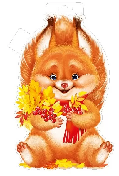 Двусторонний вырубной плакат — белка в красном шарфе с букетом осенних листьев. Подойдет для подготовки к празднику Осени. Может использоваться в качестве настенного украшения или декорации.