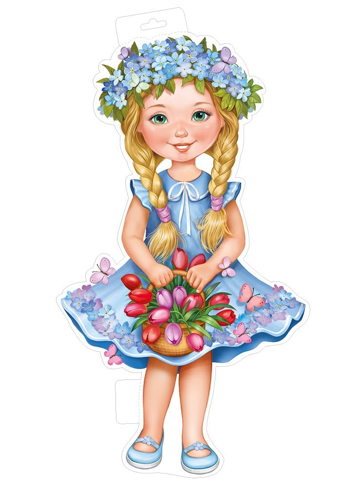 Вырубной плакат формата А3 представляет собой фигурное полноцветное изображение девочки с косами в голубом платье и венке из цветов, держащей корзину с тюльпанами. Изделие выполнено из плотного картона, что обеспечивает стабильную форму при вертикальном размещении и устойчивость к деформации при транспортировке и хранении. Двусторонняя печать делает плакат удобным для размещения в витринах, на подвесных конструкциях и в проходных зонах, где изображение должно быть одинаково читаемо с обеих сторон. Размер готового изделия 502 × 270 мм позволяет использовать его как одиночный акцент в оформлении помещения или как элемент серии при комплексном декорировании. Фигурная вырубка по контуру персонажа придаёт изделию законченный вид и облегчает визуальную интеграцию в интерьер без необходимости дополнительного фона. Плакат поставляется в количестве 10 штук, что удобно для оптовых закупок при оформлении сетевых магазинов, детских центров, дошкольных учреждений, школ, студий творчества и организаций, проводящих сезонные или праздничные мероприятия. Отсутствие текста внутри делает изделие универсальным по тематике: оно подходит для весеннего и цветочного оформления, к 8 Марта, последнему звонку, дням рождения, тематическим фотозонам и детским праздникам. Нейтральный образ девочки с цветами легко сочетается с другими декоративными элементами, гирляндами, плакатами и подвесными мобилями, что позволяет использовать данный вырубной плакат в составе широкого ассортимента оформительской продукции. Картонная основа удобна для крепления на стандартный скотч, клейкие ленты, подвесы или пластиковые держатели, при аккуратном обращении изделие может использоваться многократно. Плакат поставляется без дополнительной отделки, что снижает риск появления бликов при ярком освещении и облегчает фотографирование оформленных зон.