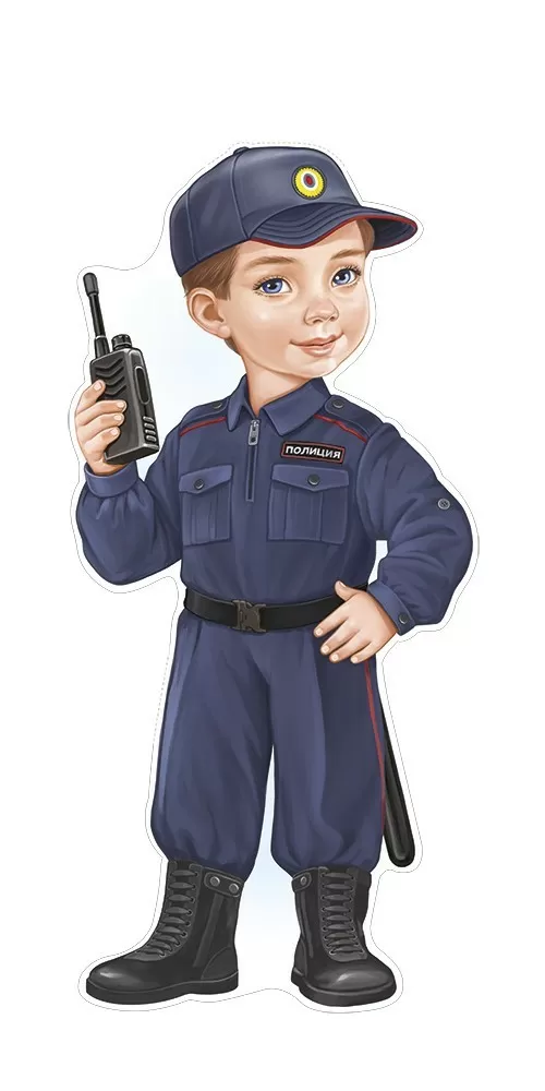 Вырубной двусторонний плакат с изображением мальчика-полицейского в форме. Подойдет для оформления уголка профессий в школе и детском саду.