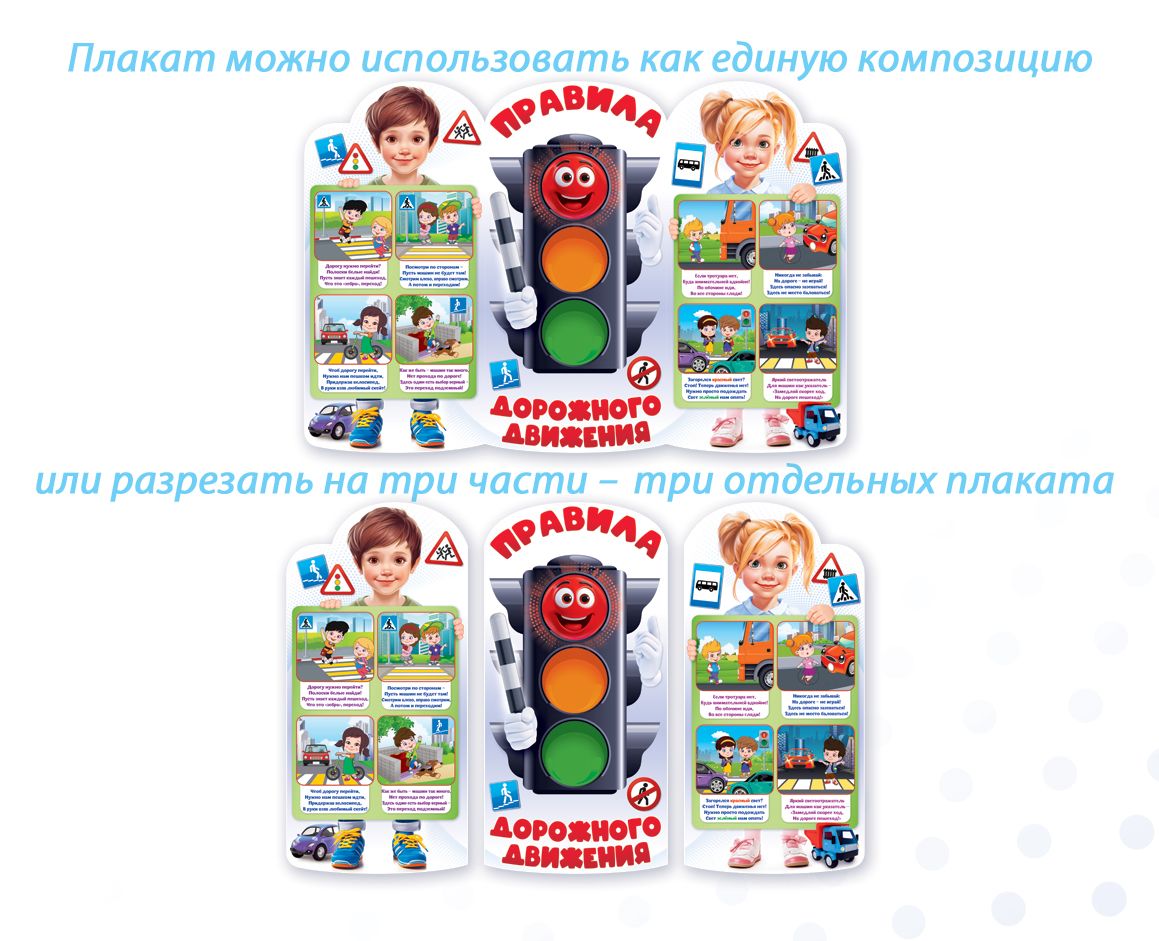 Вырубной плакат формата А1 представляет собой крупноформатное наглядное пособие по правилам дорожного движения для детей, выполненное на картоне с фигурной вырубкой по контуру композиции. Размер готового изделия составляет 974 × 666 мм, что обеспечивает хорошую читаемость иллюстраций и заметность плаката в помещении при настенном размещении. Материал основы – плотный картон, устойчивый к деформации, что важно при эксплуатации в детских учреждениях, учебных центрах, автошколах, торговых и развлекательных зонах. Поверхность плаката рассчитана на длительное использование в помещениях, сохраняет форму при вертикальном креплении и удобна для транспортировки и складского хранения в стопах. Изображение построено вокруг центрального персонажа-светофора и тематических сцен с детьми и транспортом, иллюстрирующих безопасное поведение на дороге и пешеходных переходах, что делает изделие функциональным элементом визуальной навигации и обучения. Композиция структурирована блоками, каждый из которых содержит рисунок ситуации на дороге и поясняющий текст, поэтому плакат может использоваться как самостоятельный дидактический материал на занятиях по безопасности дорожного движения с младшими школьниками и дошкольниками. Для оптового покупателя важна унифицированность размера и материала: плакат удобен для включения в серию однотипных обучающих изделий, подходит для стандартных стендов и экспозиций, может комбинироваться с другими плакатами по тематике ПДД. В упаковке 10 экземпляров, что оптимально для комплексного оснащения групп в детском саду, нескольких классов школы, сетевых образовательных и развивающих центров. Конструкция без объемных элементов и дополнительных крепежных деталей позволяет использовать стандартные способы монтажа: подвес на шнур, крепление на двусторонний скотч или размещение в настенных информационных зонах. Плакат ориентирован на размещение в интерьере, обеспечивает визуально понятную подачу правил дорожного движения для детей и может служить постоянным напоминанием о безопасном поведении на дороге.