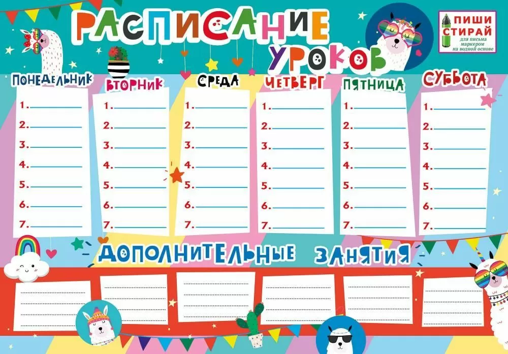 На ламинированной поверхности этого плаката можно писать маркером на водной основе, а потом стирать написанное. Яркий дизайн с весёлыми облачками и ламами вызывает только приятные эмоции, поэтому заполнять его будет одно удовольствие! «Расписание уроков» из серии «Пиши-стирай» поможет школьнику организовать свою учебную неделю с уроками и дополнительными занятиями и всегда напомнит то, о чём важно не забыть! Многоразовый плакат станет отличным подарком для мальчиков и девочек ко Дню знаний на 1 сентября или на выпускной в детском саду.