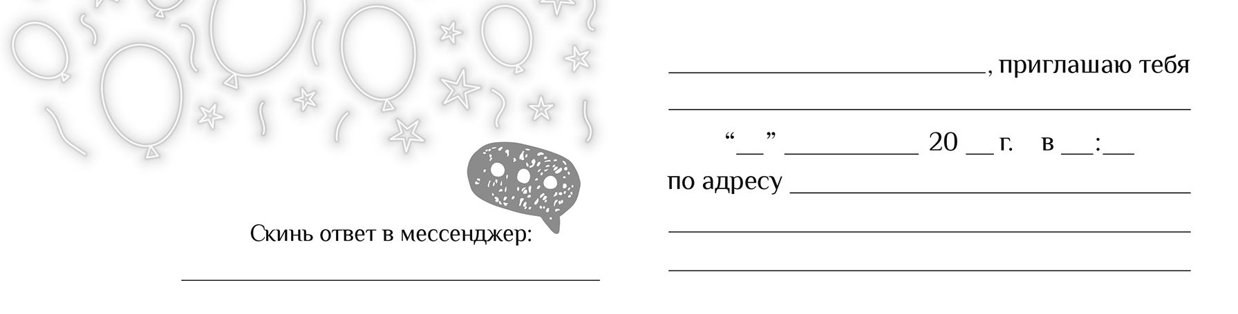 Приглашение формата А6 изготовлено из плотного картона, обеспечивающего стабильную форму и устойчивость к деформации при хранении и транспортировке крупными партиями. Габариты готового изделия составляют 126 × 64 мм, что удобно для размещения в стандартных конвертах и для раздачи гостям лично. Лицевая сторона оформлена полноцветной печатью с изображением ярких воздушных шаров и неоновых декоративных элементов на темном фоне, на фронтальной части размещена надпись «Приглашаю на мой праздник», хорошо читаемая с расстояния и подходящая для детских и семейных мероприятий, дней рождения и небольших корпоративных встреч неформального характера. Для дополнительного визуального акцента используется фольга золотая, подчеркивающая отдельные элементы дизайна и создающая контраст при искусственном и естественном освещении, что важно при выкладке на полке и формировании привлекательного ассортимента. Внутри предусмотрен текст-подсказ, помогающий быстро и аккуратно заполнить основные данные о мероприятии: дату, время, место проведения и контактную информацию, что снижает риск ошибок и экономит время при массовой подготовке праздника. Картонная основа хорошо держит нанесение шариковой и гелевой ручки, не давая чернилам растекаться, что удобно как для частных пользователей, так и для организаторов мероприятий, оформляющих большое количество приглашений вручную. Поверхность не имеет дополнительной ламинации, поэтому бланк легко подписывается без смазывания надписей, а компактный размер позволяет хранить и перевозить упаковки в стандартных коробах, оптимизируя складские и логистические процессы. Универсальный тематический дизайн без привязки к возрасту и полу получателя делает данное приглашение удобной позицией для расширения базового ассортимента праздничной продукции в розничных и оптовых продажах. Количество в упаковке: 20.