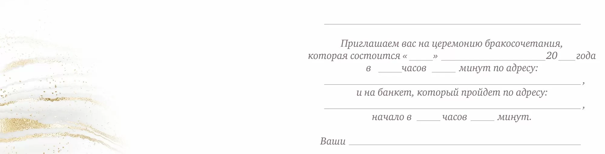 Стильное свадебное приглашение поможет со вкусом организовать праздник. Такая небольшая элегантная деталь сделает мероприятие еще более торжественным и официальным. Пригласительное имеет двойное сложение. Открытка украшена легким романтичным рисунком. Золотая фольга придает дополнительное сияние и волшебный эффект. Внутри есть разлиновка и шаблон для имен гостей, времени и места проведения мероприятия. Материал — плотный картон. Размеры приглашения в сложенном виде — 126х64 мм. Купить приглашения оптом можно на нашем сайте. Количество экземпляров в одной упаковке — 20 штук.