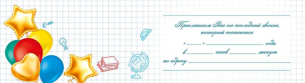 Приглашение формата А6 предназначено для оформления официальных приглашений на мероприятие «Последний звонок» в общеобразовательных учреждениях. Изделие выполнено из плотного картона, что обеспечивает устойчивость к деформации при транспортировке, хранении и раздаче адресатам, а также сохраняет внешний вид в течение всего периода подготовки и проведения торжества. Лицевая сторона содержит крупную надпись «Приглашение на последний звонок» на фоне разлиновки в стиле школьной тетради с тематическими графическими элементами (глобус, книги, формулы, лампочка) и яркими изображениями воздушных шаров и звёзд, что позволяет визуально идентифицировать назначение изделия без дополнительной маркировки. Внутри предусмотрен текст-подсказ для заполнения основных данных о мероприятии: наименование учебного заведения, дата, время и место проведения, а также поле для указания адресата, что упрощает массовое оформление приглашений при подготовке школьных выпускных событий. Размер готового изделия 126 × 64 мм удобен для вложения в стандартные конверты, раздачи лично в руки и компактного хранения в папках или коробах при оптовых поставках. Картонная основа совместима с большинством видов ручек и маркеров, что снижает риск смазывания надписей при заполнении. Отсутствие дополнительной отделки делает приглашение универсальным для использования в школах с различным стилем оформления праздника и не создаёт бликов при копировании или фотографировании. Упаковка содержит 20 единиц, что позволяет оптимизировать расчёт необходимого количества на класс, параллель или учебное заведение, а также упрощает планирование закупок и логистику при формировании ассортимента для сезонных продаж.