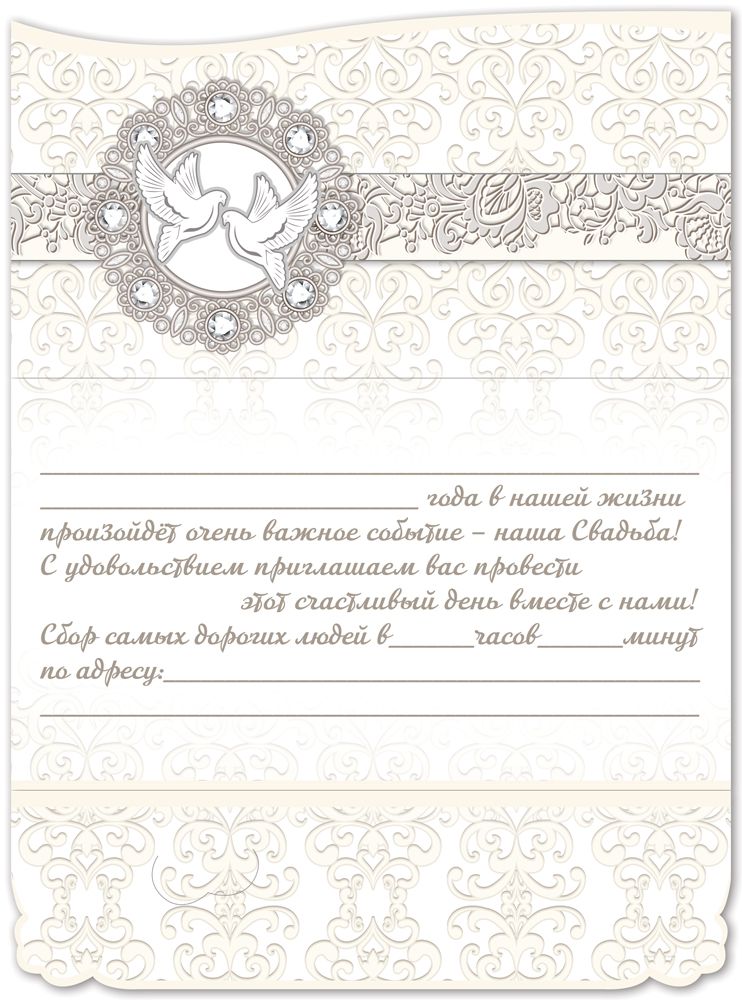 Приглашение формата А6 изготовлено из плотного картона, устойчивого к многократному раскрытию и транспортировке без деформации. Готовое изделие имеет длину 140 мм и ширину 86 мм, что удобно для стандартных почтовых конвертов и упаковочных решений при массовых рассылках. Фигурная вырубка обеспечивает аккуратный контур и ровные края, что важно для единообразного внешнего вида в оптовых партиях и при выкладке на полке. Лицевая сторона оформлена орнаментом с плавными завитками и центральной композицией с парой голубей и декоративными элементами под кристаллы, что визуально подчеркивает свадебную тематику и делает изделие универсальным для оформления торжественных мероприятий. Отделка выполнена серебряной фольгой, что создает устойчивый к истиранию металлический блеск, хорошо читаемый при искусственном и дневном освещении; покрытие рассчитано на длительное хранение без потери декоративных свойств при соблюдении стандартных условий складирования. Внутри предусмотрен печатный текст-подсказ, упрощающий заполнение и сокращающий время подготовки большого количества приглашений при организации мероприятий с большим числом гостей; при необходимости остаётся достаточно свободного места для внесения индивидуальных данных. Конструкция приглашения рассчитана на удобную сортировку, упаковку и пересылку: компактный формат и однородный материал позволяют формировать устойчивые стопки, минимизируя риск заломов в коробах и транспортной таре. Нейтральная цветовая гамма на основе светлых пастельных оттенков упрощает сочетание приглашения с другими элементами полиграфии и декора, что важно при комплексной закупке ассортимента для свадебных салонов, агентств и розничных точек. В упаковке 10 изделий, что удобно для планирования остатков, формирования кратных заказов и розничной продажи небольшими партиями.