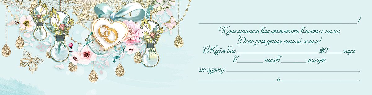Приглашение на свадьбу формата А6 изготовлено из плотной мелованной бумаги, обеспечивающей стабильную геометрию изделия и удобство при хранении и транспортировке крупными партиями. Готовый размер приглашения составляет 126 × 64 мм, что позволяет компактно размещать его в стандартных конвертах и использовать в массовых почтовых рассылках. Лицевая сторона оформлена в светло-бирюзовой гамме с флористическими элементами, декоративными подвесками в виде лампочек с букетами и центральной композицией с обручальными кольцами, что визуально однозначно фиксирует свадебную тематику и делает изделие универсальным решением для различных сценариев оформления торжества. Декорирование выполнено с применением золотых блесток в лаке, создающих акцентные зоны без существенного увеличения толщины слоя, что важно для оптовой логистики: приглашения не слипаются, сохраняют плоскость и не требуют дополнительных разделителей в упаковке. Внутри предусмотрено свободное поле для ручного внесения данных о дате, времени и месте проведения мероприятия, а также имен приглашенных, что позволяет адаптировать единый тираж под разные форматы свадеб — от камерных до масштабных. Бумага обладает достаточной жесткостью для аккуратной подписи обычными и гелевыми ручками без смазывания при стандартном времени высыхания чернил. Небольшой размер и умеренная масса обеспечивают экономичный почтовый тариф и удобство транспортировки для организаторов и агентств, работающих с оптовыми объемами. В упаковке 20 штук, что упрощает планирование закупок, подсчет необходимого количества на мероприятие и формирование ассортимента в розничной выкладке. Такое исполнение приглашения подходит для использования в свадебных салонах, полиграфических и сувенирных отделах, а также частными заказчиками, которым требуется готовое к заполнению решение с нейтральным, легко сочетаемым с большинством свадебных концепций дизайном.