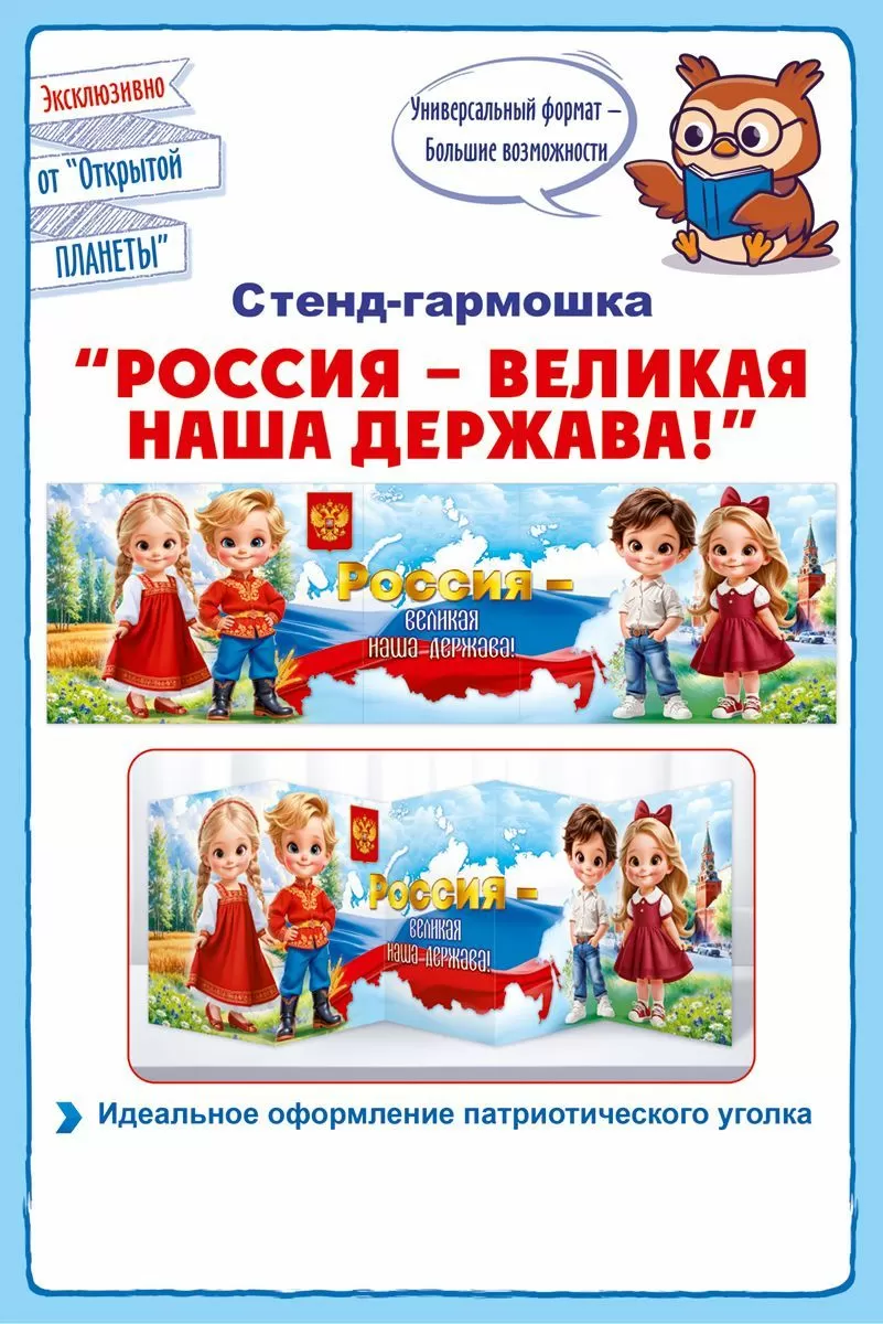 Стенд-гармошка станет полезным декором для группы детского сада или школьного патриотического уголка. Яркие иллюстрации привлекают внимание, помогают пробудить гордость за страну и подстегнут интерес к дальнейшему ее изучению.
