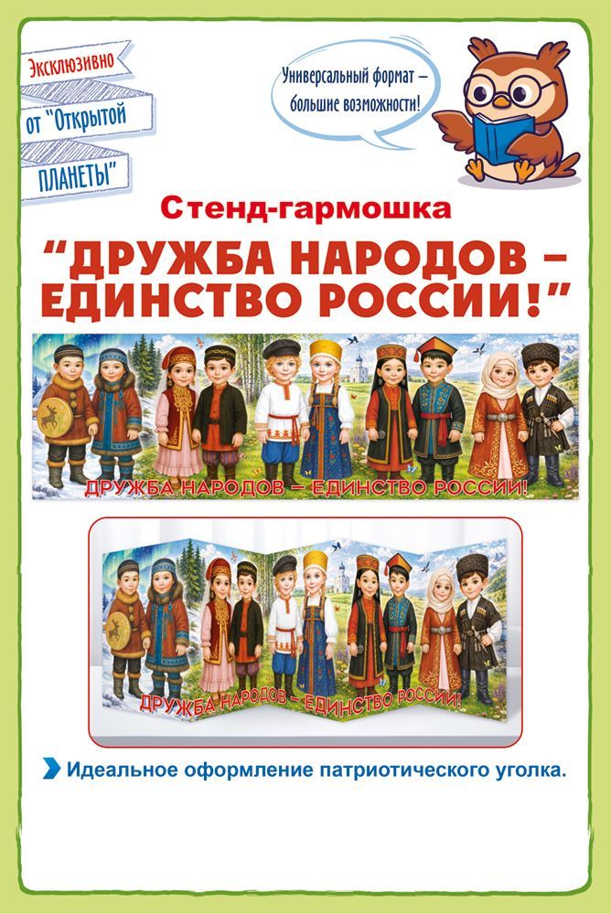 Стенд-гармошка из картона предназначен для оформления помещений образовательных и детских учреждений, культурных центров и массовых мероприятий, связанных с тематикой межнационального общения и патриотического воспитания. Конструкция выполнена в виде складной гармошки длиной 971 мм и шириной 295 мм, что обеспечивает хорошую обзорность при размещении на стене, двери, ширме или выставочном стенде и при этом не требует большого пространства для хранения. Изделие изготовлено из плотного картона, устойчивого к деформации при многократном складывании и транспортировке, что важно при оптовых поставках и регулярном использовании в разных аудиториях. На лицевой стороне размещена крупноформатная цветная иллюстрация с изображением детей в национальных костюмах народов России на фоне характерных пейзажей, в нижней части выделен тематический девиз «Дружба народов – единство России!». Внутренняя сторона не содержит текста и может использоваться как нейтральная оборотная поверхность либо основа для самостоятельного размещения информации при необходимости. Конструктив гармошки облегчает монтаж: стенд можно крепить на двусторонний скотч, кнопки или подвесные системы, а при хранении он складывается до компактного формата, что удобно при централизованных закупках для школ, кружков, библиотек и домов культуры. Отсутствие дополнительных элементов отделки делает поверхность удобной для регулярной сухой чистки и снижает риск повреждений при частых перемещениях. Стенд поставляется по 1 штуке, что позволяет точно планировать количество модулей под разные помещения и форматы мероприятий, формируя единый визуальный ряд в рамках тематического оформления.