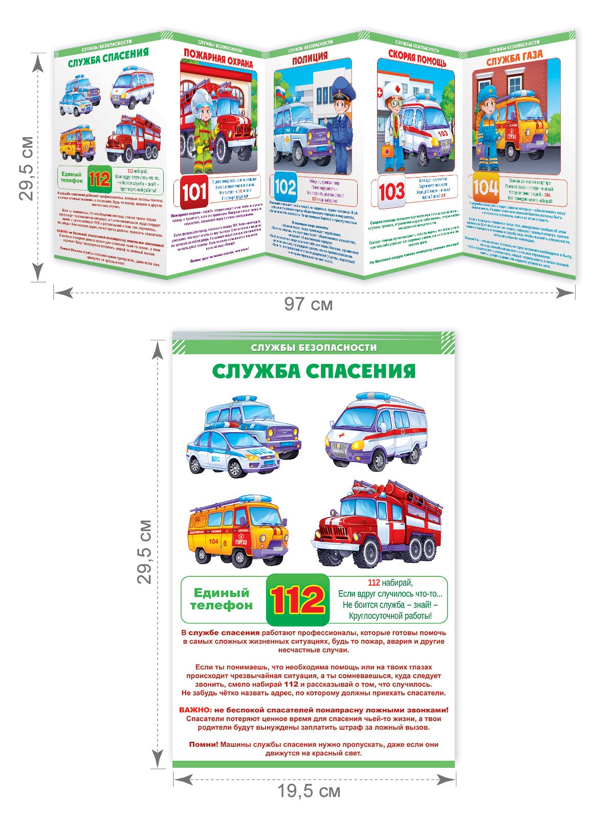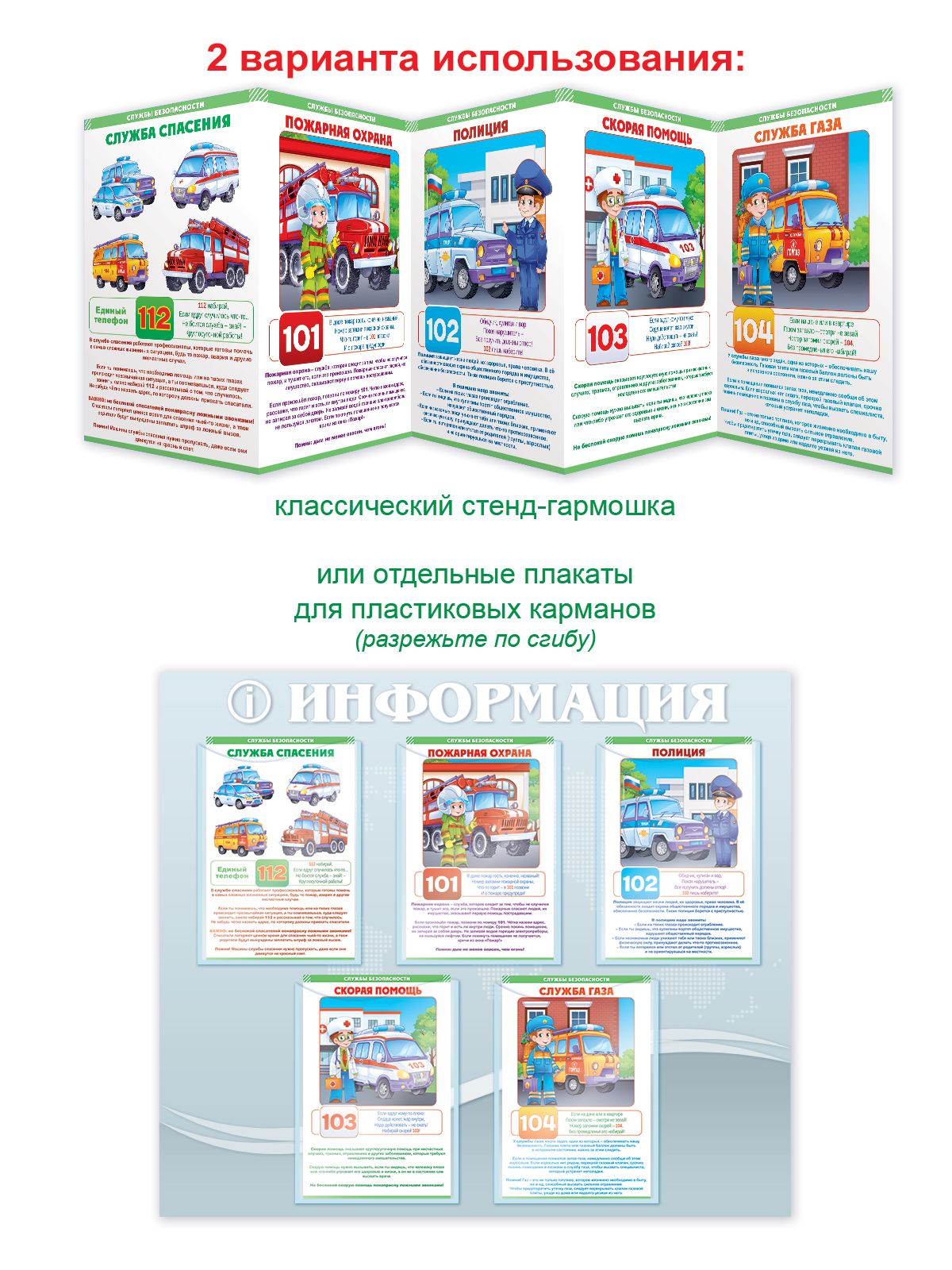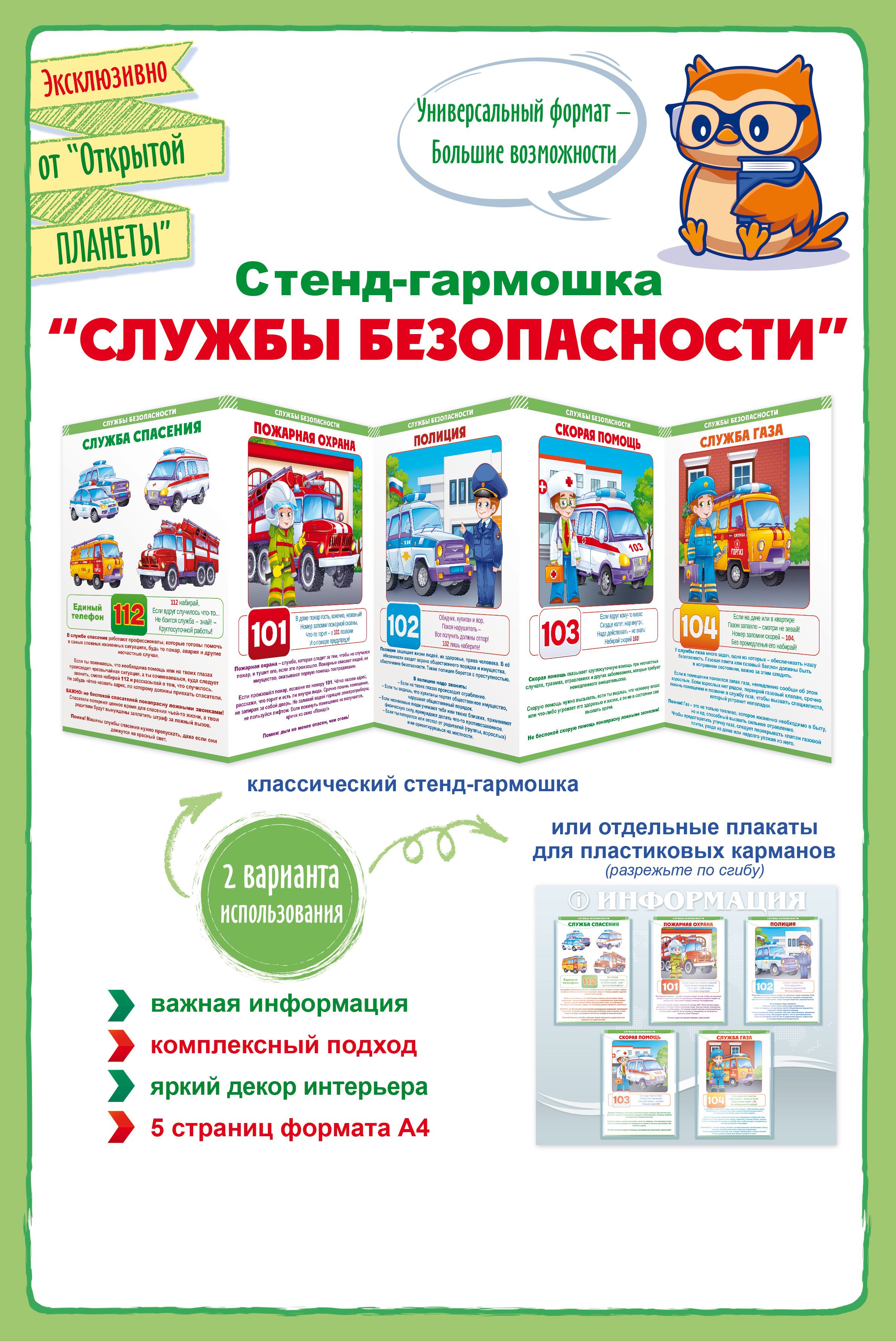 Стенд-гармошка «Службы безопасности» представляет собой готовое настенное информационное решение формата до 1 м длиной, выполненное из плотного картона с полноцветной печатью. Конструкция типа «гармошка» обеспечивает общую длину готового изделия 971 мм при ширине 295 мм, что соответствует размещению пяти последовательно соединённых страниц формата, близкого к А4. Стенд поставляется с уже нанесённым текстом и иллюстрациями по основным службам безопасности: служба спасения, пожарная охрана, полиция, скорая помощь, служба газа. Информационные блоки содержат номера вызова экстренных служб и краткие правила поведения, структурированы по разделам и читаемы с расстояния, удобного для группового ознакомления. Материал подобран с учётом регулярной эксплуатации в помещениях образовательных и детских учреждений, кружков, развивающих центров, а также в зонах ожидания и приёма посетителей; картон сохраняет форму при многократных сгибах и раскладывании, что важно при частой смене мест размещения и сезонной ротации на стендах. Габариты изделия позволяют использовать его как единый стенд-гармошку или разрезать по сгибам на отдельные плакаты для установки в пластиковые карманы и модульные системы отображения информации, что удобно для оптовых закупок под разные форматы интерьеров и существующие стендовые решения. Поверхность пригодна для аккуратной влажной протирки без применения абразивных средств, что облегчает уход в условиях интенсивной эксплуатации. Стенд поставляется в виде сложенной гармошки, занимает минимум места при хранении и транспортировке, что снижает складские и логистические издержки при оптовых поставках. Количество в упаковке: 1.