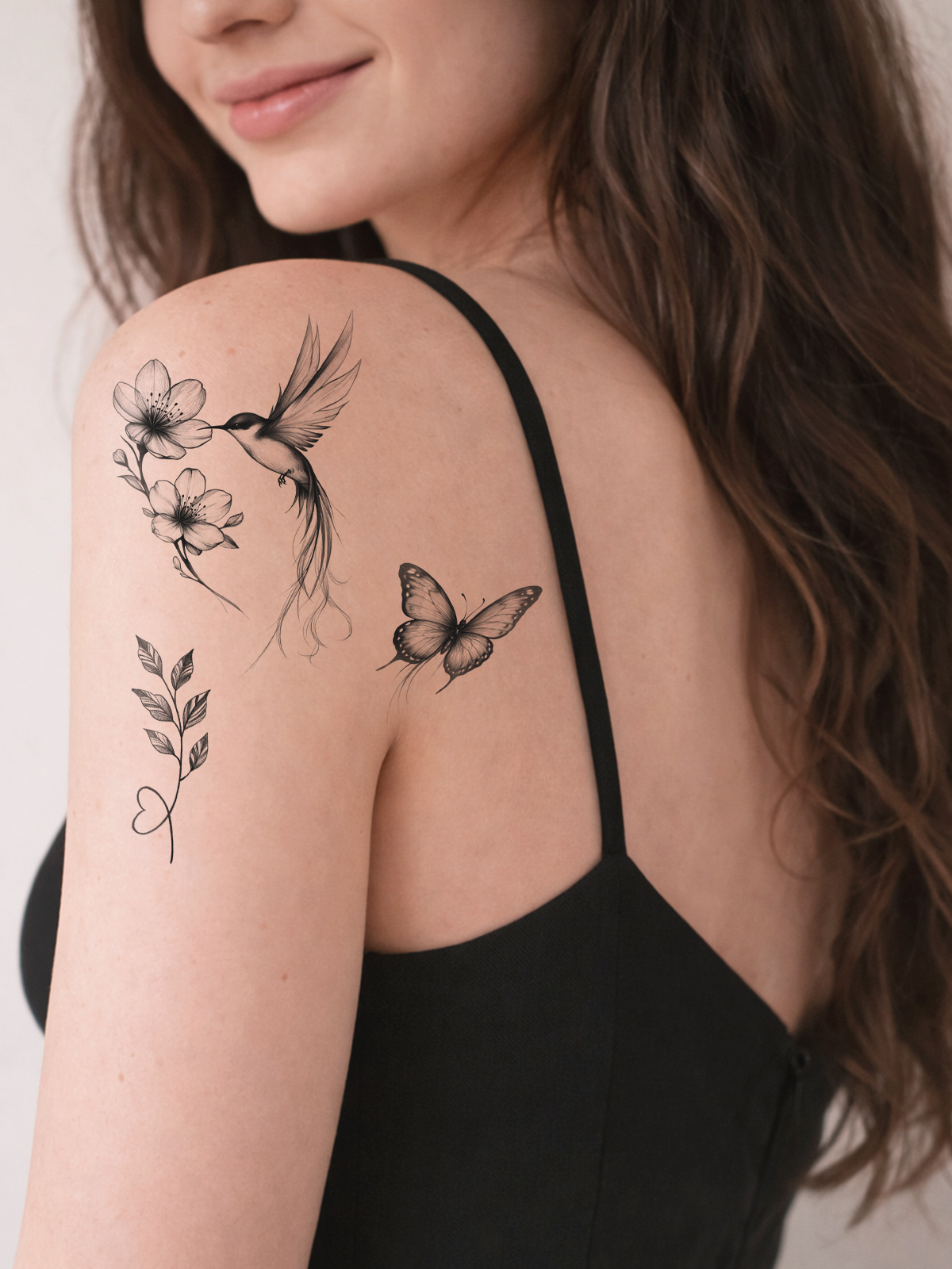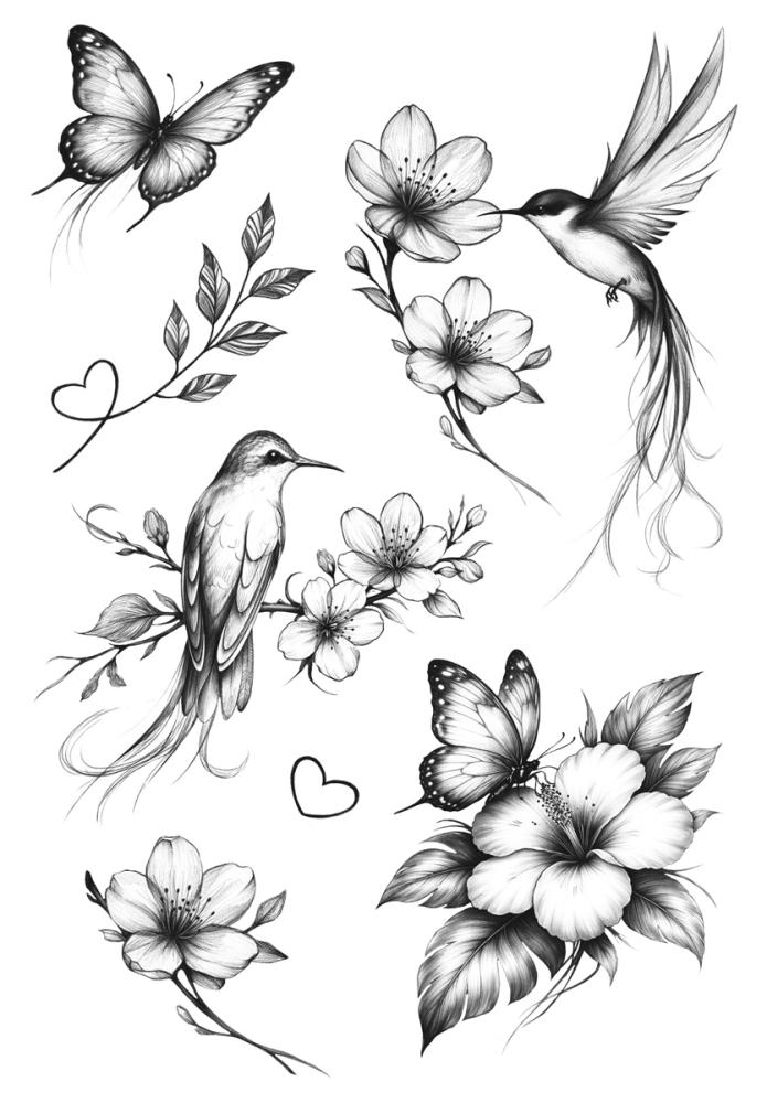 Татуировка временная "Колибри в цветах" (колибри, цветы)