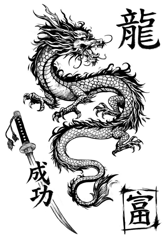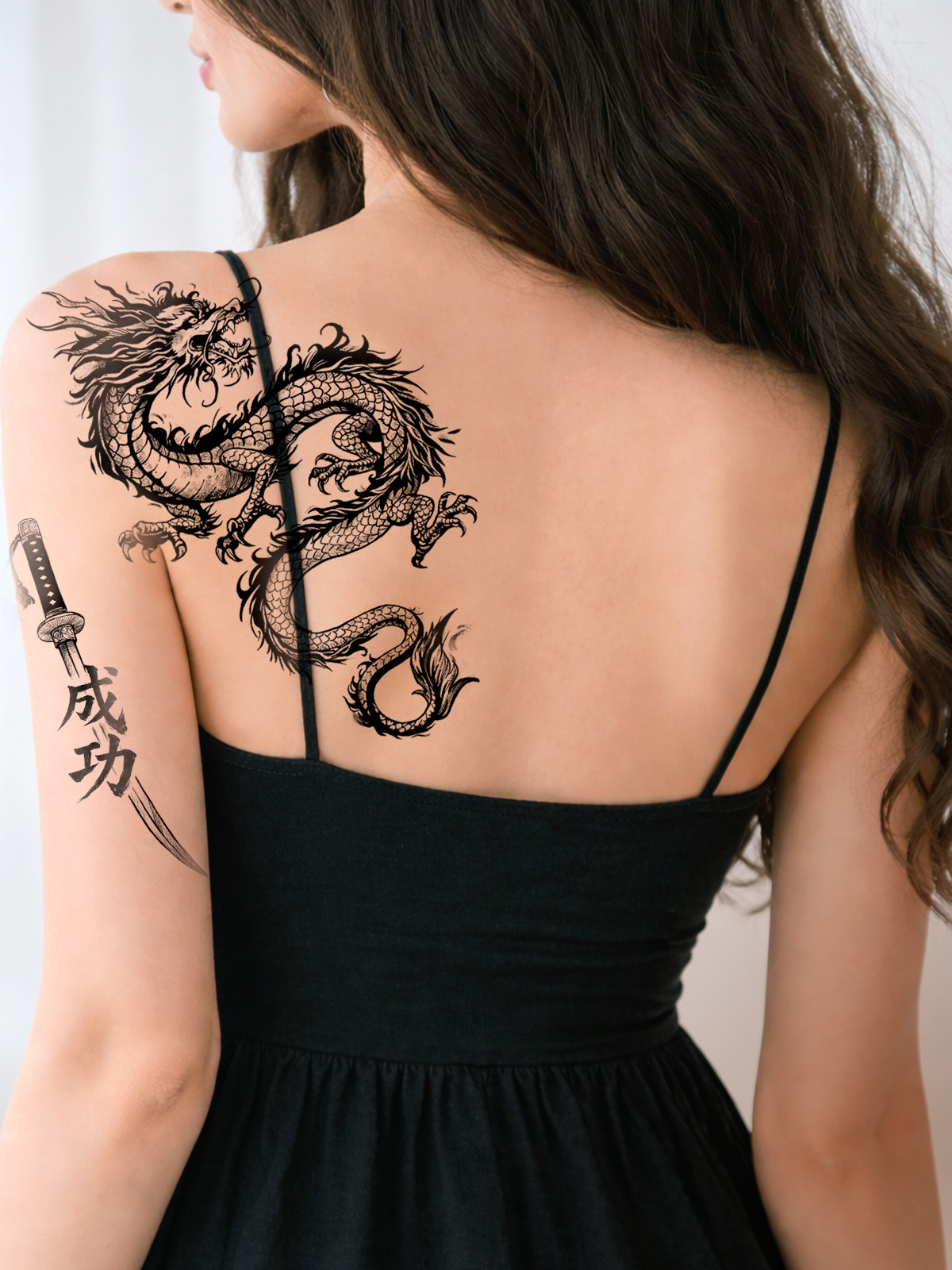 Татуировка временная "Дракон" (дракон, катана, иероглифы)