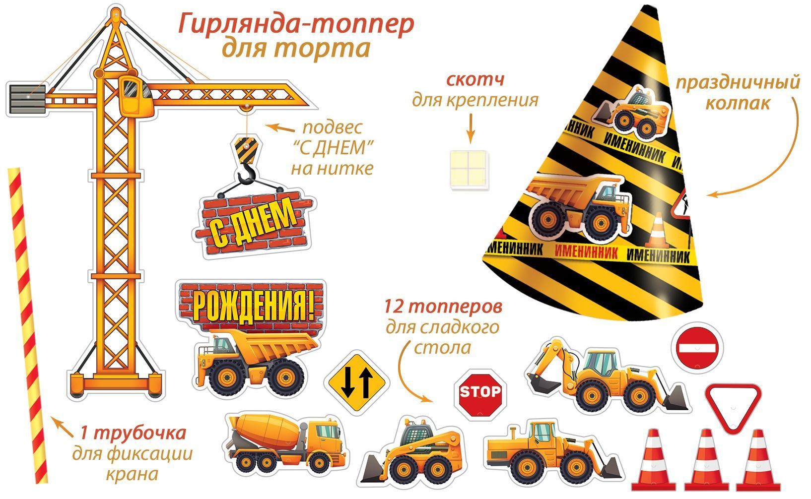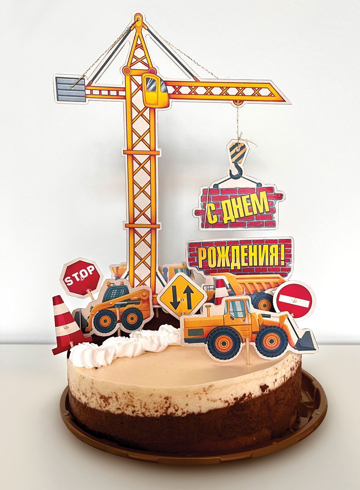 Топпер представляет собой набор фигурных декоративных элементов из плотного картона для оформления тортов и десертов в тематике строительной площадки. В комплект входит 16 отдельных деталей с полноцветной печатью: строительный кран, спецтехника, дорожные знаки и другие элементы, рассчитанные на размещение на верхней плоскости торта и порционных изделий. Готовое изделие имеет ориентировочные габариты 300 × 200 мм, что позволяет использовать его как для стандартных круглых тортов среднего диаметра, так и для прямоугольных тортов витринного формата. Длина шнура 300 мм обеспечивает возможность сборки декоративной гирлянды‑топпера и гибкую компоновку элементов в зависимости от размеров изделия кондитера. Материал — картон достаточной жесткости, сохраняющий форму при установке в кремовые и бисквитные поверхности, устойчивый к кратковременному контакту с пищевой продукцией при условии непрямого соприкосновения с влажным слоем. Фигурная вырубка выполняется с высокой точностью, края ровные, без заусенцев, что важно при серийной выкладке и формировании однородной витрины. Набор поставляется в количестве 1, удобен для поштучного учета и фасовки в оптовых партиях, не требует сложных условий хранения, компактен при транспортировке и может храниться на складе вместе с другой праздничной одноразовой кондитерской упаковкой. Отделка без дополнительного лакирования и тиснения делает изделие легким по весу и снижает себестоимость при массовых закупках, при этом печать остается достаточно контрастной и хорошо читаемой на фотографиях онлайн‑каталога и в витринной выкладке. Отсутствие заранее заданного текста внутри элементов позволяет использовать топпер для разных мероприятий, в том числе детских дней рождения, тематических корпоративных праздников и профессиональных дат строительной тематики, а также комбинировать его с другими декоративными аксессуарами в ассортименте.