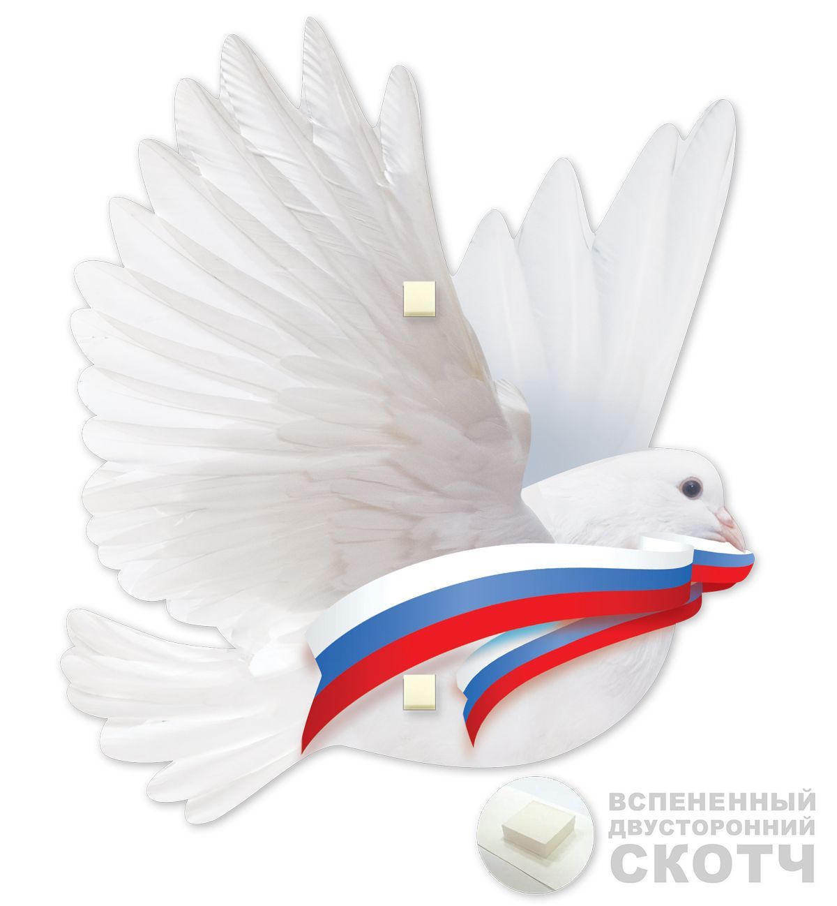 Украшение на скотче формата А5 выполнено из плотного картона с фигурной вырубкой в виде белого голубя с развёрнутыми крыльями и декоративной лентой в цветах российского флага. Изделие имеет двустороннее изображение без надписей, что позволяет использовать его в пространстве с любым направлением обзора и не привязывает к конкретному текстовому оформлению. Поверхность украшения покрыта глянцевым УФ-лаком, за счёт чего изображение устойчиво к выцветанию, истиранию и кратковременному воздействию влаги, а также сохраняет форму при частых перемещениях и многократной транспортировке. Конструктивно предусмотрен заранее приклеенный скотч, что сокращает время монтажа при массовом оформлении и исключает необходимость в дополнительных крепёжных материалах; крепление подходит для гладких поверхностей типа дверей, стен, витрин, мебели, пластиковых панелей. Длина готового изделия составляет 193 мм, ширина 166 мм, что удобно для комбинирования с другими декоративными элементами в серии, размещения на ограниченных по площади зонах и формирования модульных композиций. Плотный картон обеспечивает достаточную жёсткость, изделие не деформируется при вертикальном размещении и хорошо держит форму на витринах, стендах, в зонах приёма посетителей и на сценических декорациях. В упаковке 10 единиц, что оптимально для оптовых закупок для школ, учреждений допобразования, домов культуры, торговых и офисных пространств, а также для розничной продажи поштучно. Украшение подходит для оформления мероприятий гражданско‑патриотической направленности, школьных линеек, тематических классных часов, выставок, корпоративных и городских событий, может использоваться как самостоятельный элемент или как часть комплексного декора с плакатами и растяжками. Компактный плоский формат облегчает хранение и складской учёт, пачки не занимают много места, не требуют специальных условий и сохраняют товарный вид при длительном хранении.