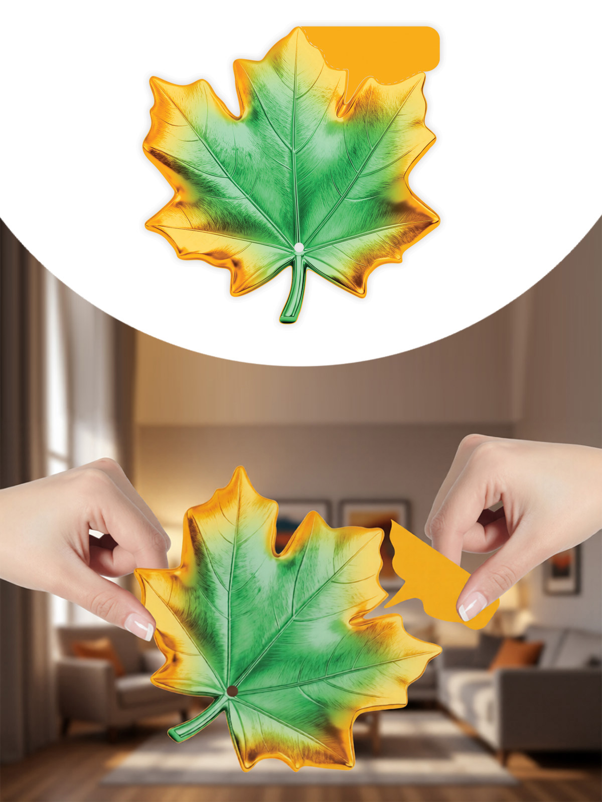 Украшение на скотче представляет собой фигурный элемент из плотного картона формата А7 с точной вырубкой в форме кленового листа. Размер готового изделия составляет 96 × 96 мм, что обеспечивает хорошую читаемость формы при компактных габаритах и упрощает выкладку в торговом зале, хранение и транспортировку крупными партиями. Изображение нанесено с двух сторон, без надписей и дополнительных текстовых элементов, за счет чего изделие подходит для использования в любых тематических оформительских проектах, не привязано к конкретному мероприятию и универсально по стилю. Цветовое решение имитирует осенний кленовый лист с плавным переходом от зеленых к желто-оранжевым оттенкам, что делает украшение функциональным элементом для сезонного декора в учебных заведениях, офисах, торговых залах, витринах, кафе и других публичных пространствах. Конструктив с приклеенным скотчем позволяет быстро закреплять украшение на гладких поверхностях: дверях, стенах, мебели, стеклянных перегородках, пластиковых панелях. Картонный материал обеспечивает достаточную жесткость, форму лист не теряет при вертикальном размещении, сохраняет внешний вид при аккуратной эксплуатации в течение сезона. Изделие поставляется по 10 штук, что удобно для оптовых закупок и формирования стандартных торговых упаковок, а также позволяет легко рассчитывать потребность при оформлении больших площадей. Компактные размеры и плоская форма снижают объем при транспортировке и складском хранении, уменьшая риск повреждений. Для розничного покупателя такое украшение может использоваться для декора детской комнаты, домашнего интерьера к осенним праздникам, оформления классов к началу учебного года или тематических фотозон. Отсутствие отделки упрощает комбинирование с другими элементами бумажного и картонного декора и не создает бликов при фотографировании.