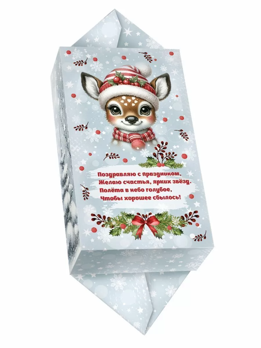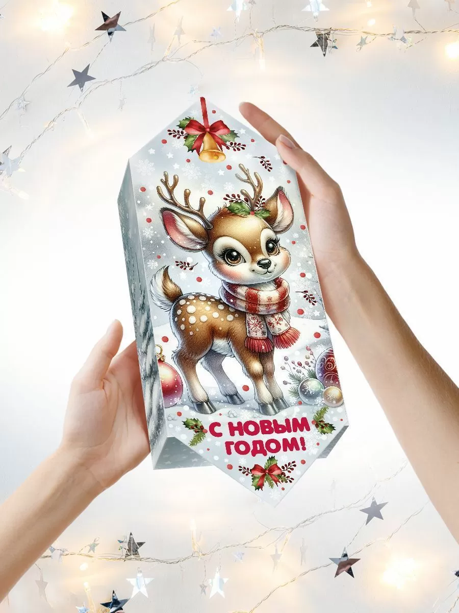 Подарочная коробка в форме большой конфеты с очаровательным олененком в шарфе среди снежинок, елочных шаров и остролиста, с красной поздравительной надписью «С Новым годом!» станет прекрасной упаковкой для сладкого подарка или небольшого сувенира на зимние праздники. Подходит для поздравления от Деда Мороза и Снегурочки в детском саду и школе. В наборе 5 штук сборных коробок. Каждая изготовлена из плотного картона высокого качества и имеет размеры 295х110х55 мм. Картонное изделие выдерживает вес до 500 г. Складная коробка собирается без клея и дополнительных усилий, что значительно экономит время для подготовки к празднику. Хорошо держит форму, удобную для транспортировки, сохраняя интригу до момента вручения. В разобранном состоянии при хранении занимает мало места. А для того, чтобы успеть к дате торжества, рекомендуем заранее приобретать коробки для подарка оптом.