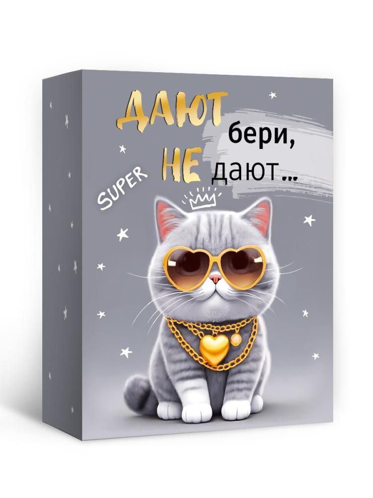 Коробка формата А4 изготовлена из плотного картона и рассчитана на единичную упаковку подарка или набора изделий среднего размера. Габариты готового изделия составляют 250 × 200 мм, что обеспечивает удобство при складском хранении, транспортировке и выкладке на полке: коробка хорошо помещается в стандартные стеллажные ячейки, не деформируется при штабелировании в несколько рядов и сохраняет форму при наполнении. Внешняя поверхность оформлена полноцветной печатью с изображением кота в очках и декоративными надписями, что делает изделие готовым решением для подарка без дополнительной обёртки. Матовая ламинация защищает печать от истирания, выцветания и появления заломов, повышает износостойкость и устойчивость к случайным загрязнениям, что важно при оптовых поставках, частой перекладке и транспортировке в коробах. Конструкция коробки дополнена открыткой, интегрированной в изделие: это упрощает комплектацию ассортимента, позволяет использовать коробку как готовый подарочный набор «упаковка + место для поздравления» и снижает потребность в дополнительных полиграфических позициях на складе. Внутри коробка не содержит текста и декоративных элементов, что удобно для универсального применения под разные поводы и целевые аудитории; ровные картонные стенки обеспечивают аккуратную фиксацию как мягких, так и жёстких вложений. Для розничного покупателя такая коробка может использоваться как подарочная упаковка для косметики, аксессуаров, сладостей, сувениров и небольших предметов одежды, при этом внешний дизайн остаётся нейтральным по тематике и подходит для неформальных праздников и личных поздравлений. Для оптового сегмента изделие представляет интерес как стабильная типовая позиция с предсказуемыми размерами и качеством исполнения: коробка поставляется в количестве 1, удобна для формирования сборных заказов, легко интегрируется в существующий ассортимент подарочной упаковки и не требует дополнительных операций по доработке перед продажей конечному покупателю.