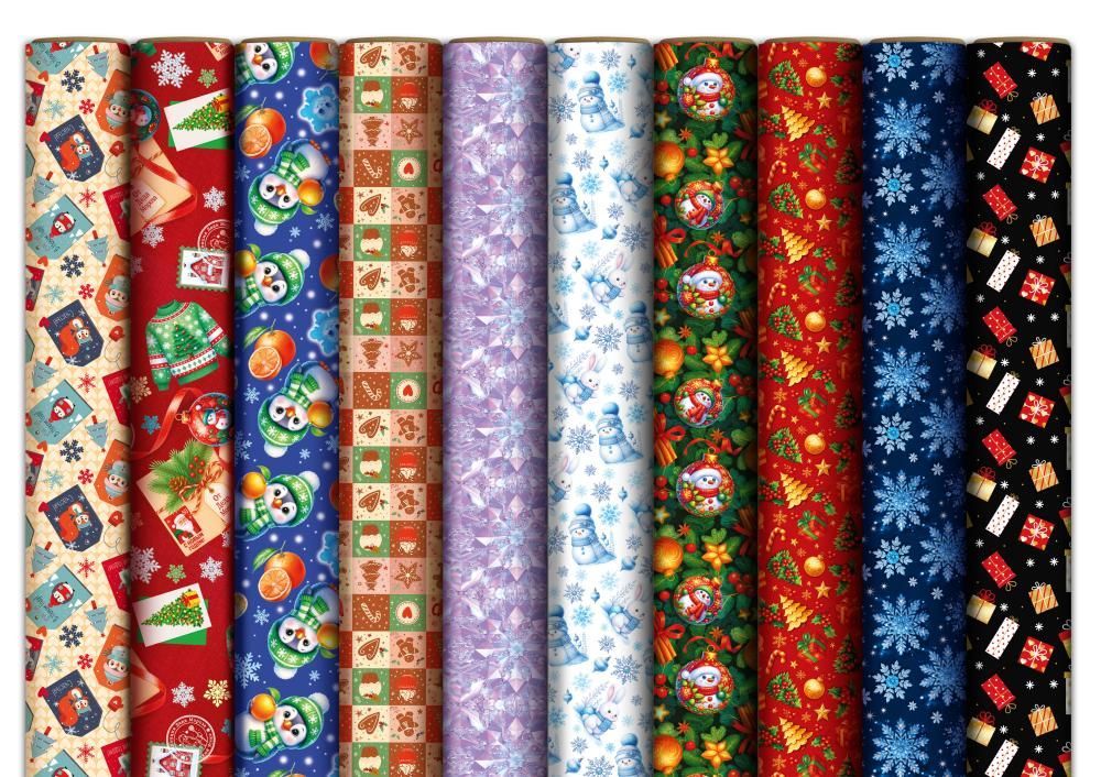 Набор упаковочной бумаги формата А0 предназначен для профессионального и розничного использования в сезонных и постоянных ассортиментных линейках. В комплект входят 50 листов из мелованной бумаги с полноцветной печатью новогодней тематики: на изображении представлены различные варианты рисунков с подарками, снежинками, зимними персонажами и праздничными орнаментами, что позволяет использовать набор как для единообразного оформления партий товара, так и для дифференциации упаковки по коллекциям или ценовым группам. Размер готового изделия 974 × 674 мм обеспечивает удобство упаковки средних и крупных подарков, коробок стандартных форматов, наборов посуды, текстиля и сувенирной продукции без необходимости стыковать несколько листов. Основа из мелованной бумаги отличается ровной гладкой поверхностью, хорошо держит форму при сгибании, не крошится по линиям фальца и совместима с большинством стандартных клейких лент, что важно при поточном оформлении подарков в магазинах, шоурумах и сервисных зонах. Поверхность имеет глянцевое покрытие ВД-лаком, которое повышает стойкость печати к истиранию, защищает красочный слой от влаги и механических воздействий при транспортировке и складском хранении, а также придаёт изображениям более выраженную насыщенность и чёткий контур. Плотность и структура материала позволяют использовать бумагу как для ручной упаковки, так и для работы на простых упаковочных столах и стойках, лист легко сворачивается в рулон и не ломается на сгибах. Отсутствие текста в дизайне делает набор универсальным по назначению: оформление подарков к Новому году и зимним праздникам, корпоративная упаковка, упаковка промо-наборов и сувениров, декор витрин и подарочных корзин. Листы удобны для хранения в горизонтальных или вертикальных стеллажах, не требуют специальных условий, сохраняют геометрию при стандартной влажности и температуре, что упрощает планирование запасов и использование набора в течение всего сезона.