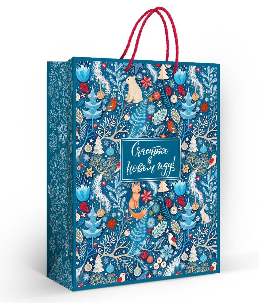 Пакет бумажный подарочный формата L изготовлен из прочной мелованной бумаги с матовой ламинацией, что повышает износостойкость поверхности, устойчивость к истиранию и случайным загрязнениям при транспортировке и выкладке. Размер готового изделия 327 × 260 мм обеспечивает размещение средних и крупных подарков: коробок с игрушками, наборами косметики, текстилем, канцелярскими наборами, сладкими подарками. Конструкция с плоским дном и усиленной верхней кромкой рассчитана на равномерное распределение нагрузки и сохранение формы при заполнении. Ручки-шнуры из синтетического материала надежно закреплены в отверстиях, что уменьшает риск разрыва при переноске и делает пакет удобным для использования в торговых точках и при вручении подарков. В упаковке 10 штук, формат оптимален для оптовых закупок с последующей розничной продажей поштучно или включения в готовые подарочные наборы. Внешняя сторона оформлена полноцветным новогодним рисунком в холодной синей гамме с изображением зимнего леса, декоративных элементов и надписью «Счастья в Новый год!», что делает пакет тематическим решением для новогодних и зимних подарков без привязки к конкретному возрасту или полу получателя. Матовая ламинация исключает блики при освещении витрин и придает ровную, аккуратную поверхность, удобную для выкладки на полках и в прикассовой зоне. Пакеты поставляются сложенными, занимают минимум места на складе и в торговом зале, не требуют дополнительной подготовки к использованию. Для розничного покупателя изделие позволяет быстро и аккуратно оформить подарок без дополнительной упаковки; плотная бумага сохраняет внешний вид даже при повторном использовании, что особенно важно при дарении объемных и относительно тяжелых презентов.
