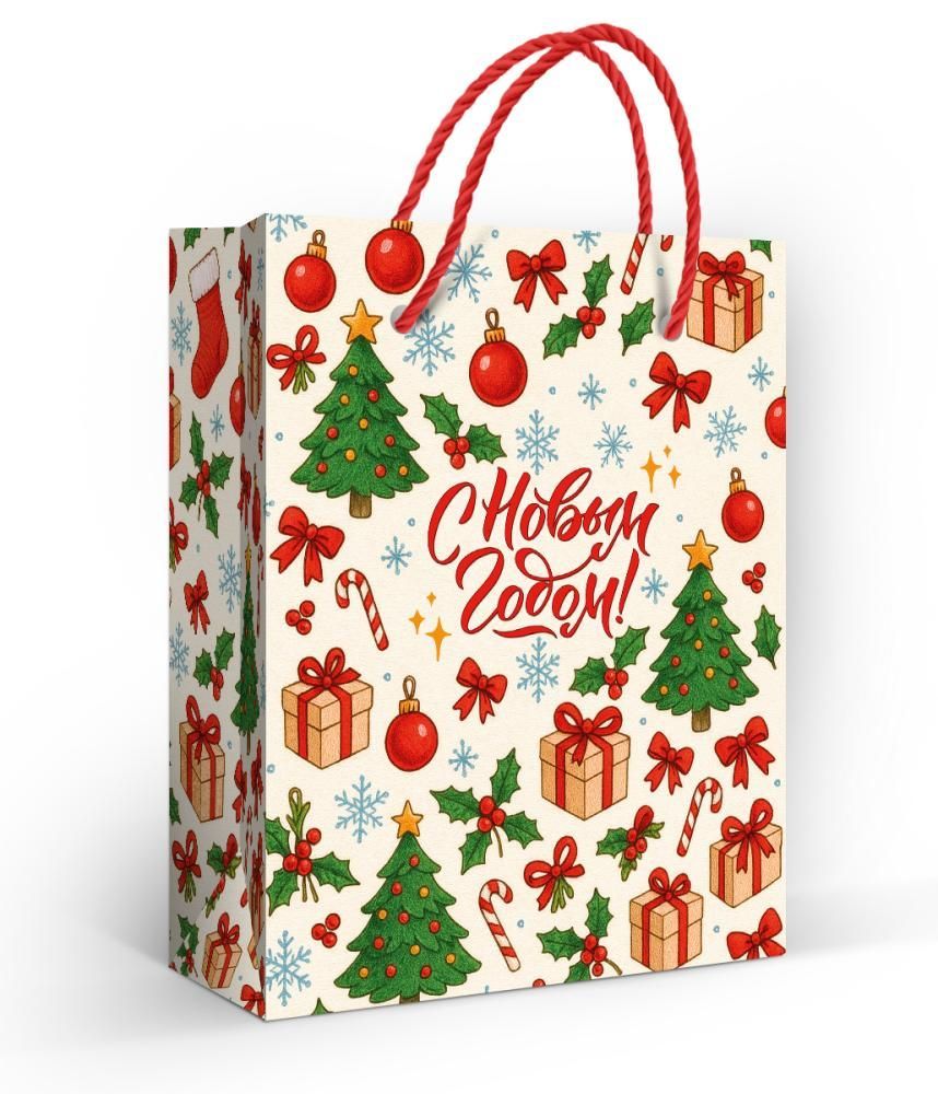 Пакет бумажный подарочный формата S изготовлен из плотной мелованной бумаги с матовой ламинацией, что обеспечивает аккуратный внешний вид, устойчивость к истиранию и разрывам при стандартной нагрузке. Размер готового изделия 135 × 110 мм позволяет использовать пакет для упаковки небольших сувениров, косметики, аксессуаров, канцелярских и промоматериалов, что удобно при формировании ассортимента розничных точек и подарочных наборов. Матовая ламинация защищает полноцветный новогодний рисунок от выцветания и влаги при кратковременном контакте, поэтому пакет сохраняет презентабельность при транспортировке и выкладке. Конструкция с прочными шнуровыми ручками рассчитана на многократное перемещение упакованных изделий на складе и в торговом зале, а также на удобное вручение подарка конечному получателю. Дизайн выполнен в тематике Нового года: на светлом фоне размещены изображения елок, подарочных коробок, елочных шаров, конфет, веток с ягодами и надпись «С Новым годом!», что делает пакет универсальным решением для сезонных продаж, корпоративных поздравлений, оформления клиентских подарков и розничных покупок к празднику. Отсутствие внутреннего текста позволяет использовать пакет в любых сценариях дарения, в том числе для комбинирования с фирменными открытками или брендированными вкладышами. Компактные размеры удобны для хранения и транспортировки крупных партий: пакеты поставляются в плоском виде, не занимают много места на складе и быстро приводятся в рабочее состояние персоналом торговой точки или отдела маркетинга. В упаковке 10 штук, что упрощает планирование закупок с привязкой к тиражам подарочных наборов, акциям и сезонным выкладкам.