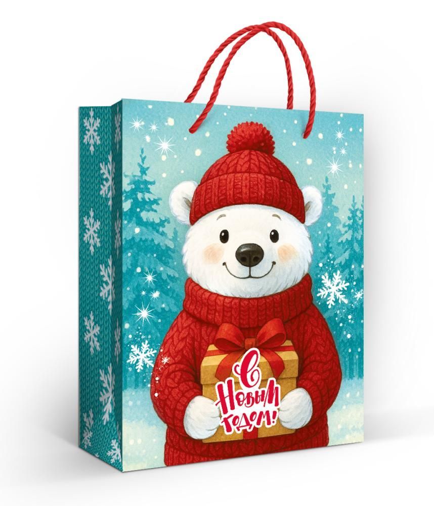 Пакет бумажный подарочный формата M изготовлен из плотной мелованной бумаги с матовой ламинацией, что повышает износостойкость поверхности, устойчивость к истиранию и разрыву по сгибам, а также сохраняет качество печати при транспортировке и хранении. Габариты готового изделия: длина 227 мм, ширина 180 мм, высота подобрана для размещения типовых подарочных наборов, косметики, текстиля, канцелярии и небольших сувениров. Конструкция пакета усилена дном и боковыми фальцами, которые обеспечивают стабильную форму под нагрузкой и позволяют компактно штабелировать изделия при складском хранении и в торговом зале. В качестве ручек использован плетёный шнур, пропущенный через усиленные отверстия; такая схема крепления рассчитана на многократное поднятие и перенос умеренно тяжёлых вложений без деформации верхнего края. Матовая ламинация защищает красочный новогодний рисунок с изображением белого медведя с подарком и надписью «С Новым годом!» от выцветания и появления заломов, что важно при длительном обороте партии и выкладке на витрине. Внутренняя поверхность без текста и дополнительных элементов, что упрощает использование пакета в различных сценариях — от корпоративных поздравлений и упаковки брендированных сувениров до индивидуальных подарков детям и взрослым. Универсальная зимняя тематика подходит для розничной продажи в предновогодний сезон и для оптовых закупок сетями, компаниями и организаторами мероприятий: дизайн воспринимается нейтрально, не требует дополнительной персонализации и сочетается с широким ассортиментом подарочной продукции. Пакеты поставляются по 10 штук, что удобно для планирования остатков, формирования витрины и оптимизации складского пространства при крупной поставке.