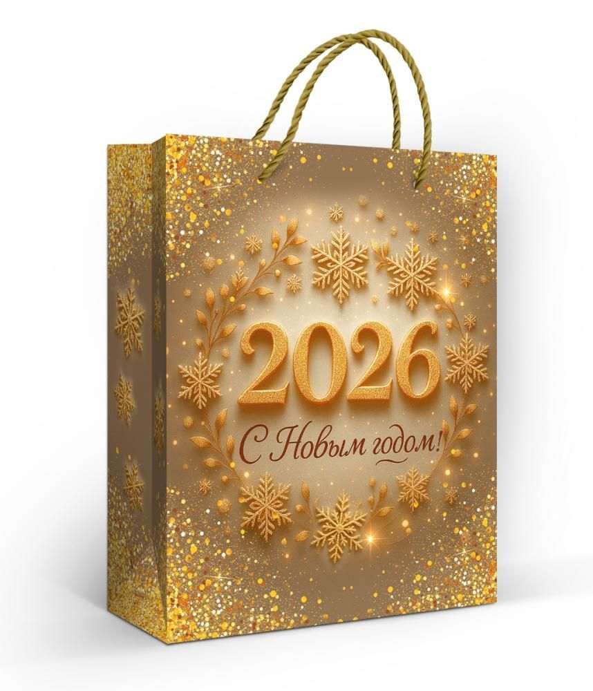 Пакет бумажный подарочный формата M изготовлен из плотной мелованной бумаги, обеспечивающей стабильную геометрию изделия и сохранность вложений при складском и транспортном обращении. Размеры готового изделия: длина 227 мм, ширина 180 мм, что удобно для упаковки средних по габаритам сувениров, косметики, канцелярских наборов, кондитерских изделий и корпоративных подарочных комплектов. Внешняя поверхность оформлена новогодним изображением с крупным обозначением года «2026» и поздравительной надписью, выполненными в единой золотистой гамме с декоративными снежинками и эффектом рассыпанных блесток; оформление рассчитано на использование в сезонных акциях и праздничных выкладках. Матовая ламинация повышает износостойкость пакета, защищает печать от истирания и влаги, позволяет сохранять первоначальный вид при многократном перемещении товара и контакте с руками. Конструкция с плоским дном обеспечивает устойчивое размещение на полке или при выкладке на кассовой зоне, а также удобство упаковки при поточном обслуживании клиентов. Переплетённые шнуровые ручки зафиксированы в верхней части пакета и рассчитаны на безопасное перенесение содержимого средней массы, что важно при выдаче подарков сотрудникам и клиентам. Внутренняя поверхность без текста и дополнительной печати, что облегчает использование пакета в качестве универсального решения для розничных и корпоративных подарков. Поставка осуществляется по 10 штук, что удобно для планирования оптовых закупок, формирования однородной новогодней линейки и оптимизации складского хранения в период сезонного спроса.