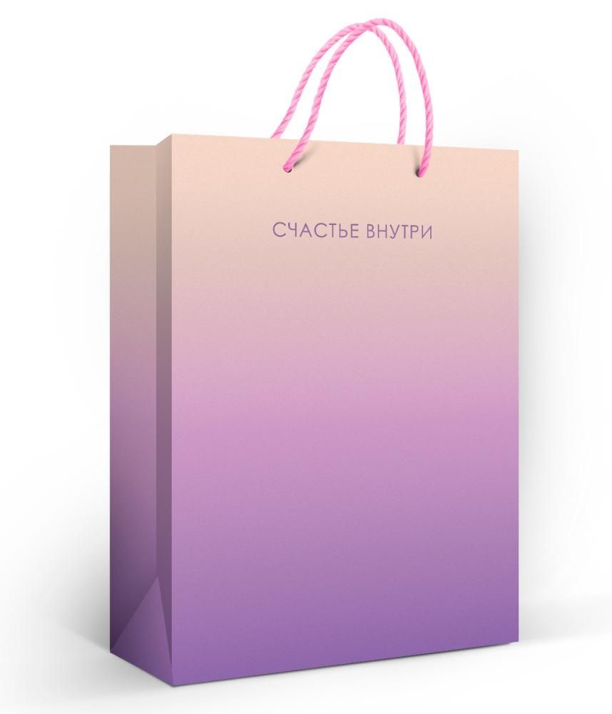 Пакет бумажный подарочный формата ML выполнен из мелованной бумаги с матовой ламинацией, что обеспечивает устойчивость к истиранию, сохранение цвета и аккуратный внешний вид при многократной транспортировке и хранении. Габариты готового изделия 310 × 220 мм позволяют использовать пакет для упаковки средних по размеру подарков, сувенирной и фирменной продукции, текстиля, аксессуаров, косметических наборов и канцелярии. Матовая ламинация повышает плотность и жёсткость полотна, пакет хорошо держит форму, не деформируется при стандартной нагрузке и подходит для выкладки на витрине и у кассовой зоны. Дизайн выполнен в виде плавного градиента от светлого бежевого к лилово‑фиолетовому тону, на лицевой стороне размещена надпись «Счастье внутри», что делает изделие универсальным для поздравлений с днём рождения, календарными и корпоративными праздниками, вручения подарков сотрудникам и клиентам без привязки к конкретному событию. Конструкция пакета предусматривает плоское складное дно и боковые фальцы, за счёт чего он поставляется и хранится в стоге с минимальным объёмом, удобен для оптовой логистики, фасовки и распределения по торговым точкам. Ручки выполнены в виде прочного крученого шнура контрастного розового цвета, закреплённого через отверстия в верхнем клапане; такое решение обеспечивает надёжный захват и комфорт при переноске, снижает риск разрыва при типовой массе вложения. Внутренняя поверхность без печати, что упрощает подбор наполнителя и фирменной упаковочной бумаги. В одной упаковке 10 единиц, что удобно для формирования ассортиментной матрицы, планирования закупок и равномерного распределения по розничным каналам. Пакет может использоваться как самостоятельное упаковочное решение или как часть комплексного оформления подарка в сетевых и небольших магазинах, шоурумах, студиях декора и частном использовании.