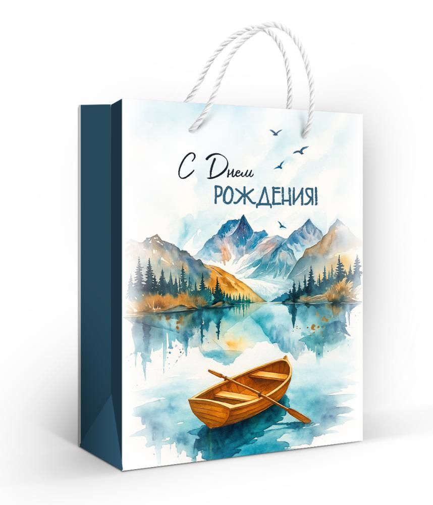 Пакет бумажный подарочный формата M изготовлен из мелованной бумаги с матовой ламинацией, что обеспечивает плотность, устойчивость к разрыву и аккуратный внешний вид при многоэтапной логистике и выкладке в торговом зале. Гладкая ламинированная поверхность защищает печать от истирания и влаги, пакет не мнётся при стандартных нагрузках и сохраняет форму при транспортировке и хранении в сложенном виде. Размер готового изделия 227 × 180 мм оптимален для упаковки средних по габаритам подарков: книг, аксессуаров, косметики, сувенирной продукции, что упрощает планирование ассортимента для оптовых закупок под основные праздничные категории. Конструкция с шнуровыми ручками рассчитана на безопасное перенесение содержимого, распределяет нагрузку по верхнему краю пакета и снижает риск деформации при наполнении. Дизайн выполнен в спокойной цветовой гамме с акварельным пейзажем: горы, озеро, лодка и птицы, на лицевой стороне размещена надпись «С Днём Рождения», что позволяет позиционировать изделие как готовое решение для поздравлений взрослой аудитории и универсально сочетать его с различными видами упаковочной бумаги и открыток. Пакет подходит для использования в розничных магазинах подарков, книжных, салонах цветов и корпоративных сервисах поздравлений, обеспечивает единый стиль оформления и позволяет быстро упаковать подарок без дополнительных затрат времени. В сложенном состоянии занимает минимум места на складе и при транспортировке, что удобно для оптового хранения крупных партий и выкладки по размерным рядам. В одной упаковке 10 изделий, что облегчает учёт и планирование остатков, а также формирование витринных и складских запасов под сезонный и круглогодичный спрос на подарочную упаковку ко дню рождения.
