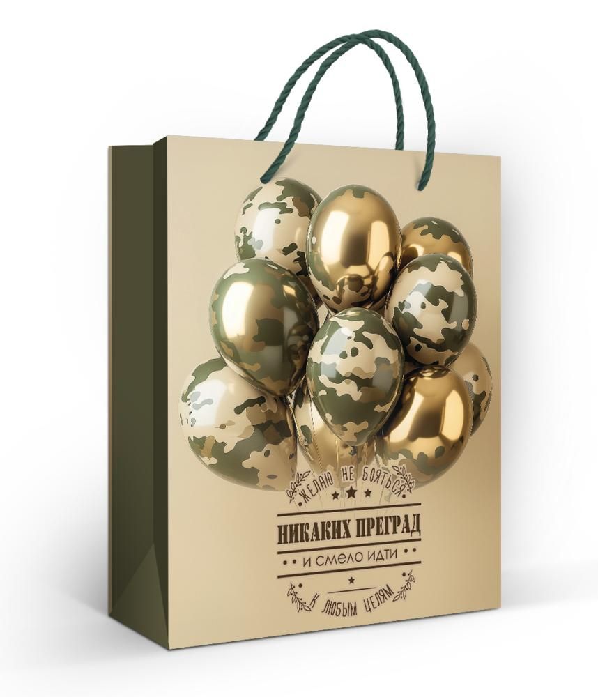 Пакет бумажный подарочный формата M изготовлен из плотной мелованной бумаги с матовой ламинацией, что обеспечивает стабильную геометрию, износостойкость и аккуратный внешний вид при многократной транспортировке и хранении на складе. Габариты готового изделия: длина 227 мм, ширина 180 мм; такие размеры удобны для упаковки средних по объему подарков, сувенирной и промопродукции, косметических наборов, аксессуаров, текстиля и мелкой бытовой техники. Матовая ламинация повышает стойкость к истиранию, влаге и загрязнениям, снижает риск появления заломов и делает пакет удобным для многоразового использования в розничном обороте. Конструкция с прочными шнуровыми ручками выдерживает вес типичных подарочных наборов, обеспечивает комфортное перенесение и снижает вероятность разрыва при точечной нагрузке. На лицевой стороне размещено изображение связки шаров в камуфляжной и золотистой расцветке и типографский декоративный блок с пожеланием, выполненный в единой графике; боковые панели выдержаны в темно-оливковом цвете, что формирует целостный дизайн и позволяет использовать пакет в мужских, военных и патриотических тематиках, а также для корпоративных мероприятий соответствующего стиля. Внутри пакет без текста и дополнительных элементов, внутреннее пространство полностью доступно под наполнение и, при необходимости, под индивидуальную вкладываемую полиграфию. Поставка по 10 штук облегчает планирование закупок для торговых точек, сувенирных и цветочных магазинов, интернет‑ритейла и компаний, формирующих подарочные наборы для сотрудников и клиентов: партия удобна для выкладки на витрину, формирования ассортимента по тематикам и контролируемого остатка на складе. Плоская форма в сложенном виде позволяет рационально использовать складские площади, пакет не деформируется при штабелировании, что важно при оптовой логистике и сезонных закупках.