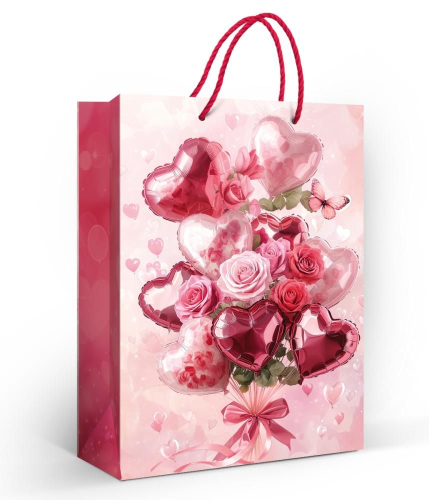 Пакет подарочный (МL) «Букет из шариков-сердечек и роз»