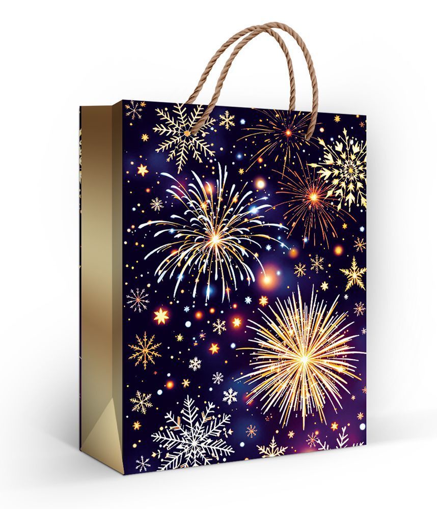 Пакет бумажный подарочный формата M изготовлен из плотной мелованной бумаги с матовой ламинацией, что обеспечивает устойчивость к истиранию, сохранение цвета и аккуратный внешний вид при многократной транспортировке и выкладке. Размер готового изделия 227 × 180 мм оптимален для упаковки средних по габаритам подарков и сувенирной продукции: косметических наборов, аксессуаров, канцелярии, небольших игрушек, текстиля. Конструкция усилена дном и боковыми фальцами, позволяющими пакету сохранять форму при нагрузке и рационально использовать внутренний объем. Переплетные шнуровые ручки обеспечивают надежный захват и комфортное переносение, выдерживают вес типичных подарков для данного формата и не деформируют край пакета. Матовая ламинация придает поверхности дополнительную жесткость, защищает печать от влаги кратковременного воздействия и механических повреждений при складском хранении и транспортировке, что важно для оптовых поставок и сохранения товарного вида до момента продажи. Дизайн выполнен без текстовых надписей и привязан к универсальной праздничной тематике: темный фон с изображением салюта и снежинок подходит для новогодних и зимних подарков, корпоративных мероприятий, сезонных акций и розничных покупок для личных торжеств. Отсутствие надписей облегчает включение пакета в ассортимент с различной ценовой и брендовой политикой, позволяет использовать его как для розничной выкладки, так и для корпоративной упаковки без дополнительной персонализации. Пакеты поставляются по 10 штук, удобно штабелируются, не занимают много места на складе и в торговом зале, что упрощает учет, хранение и планирование закупок.