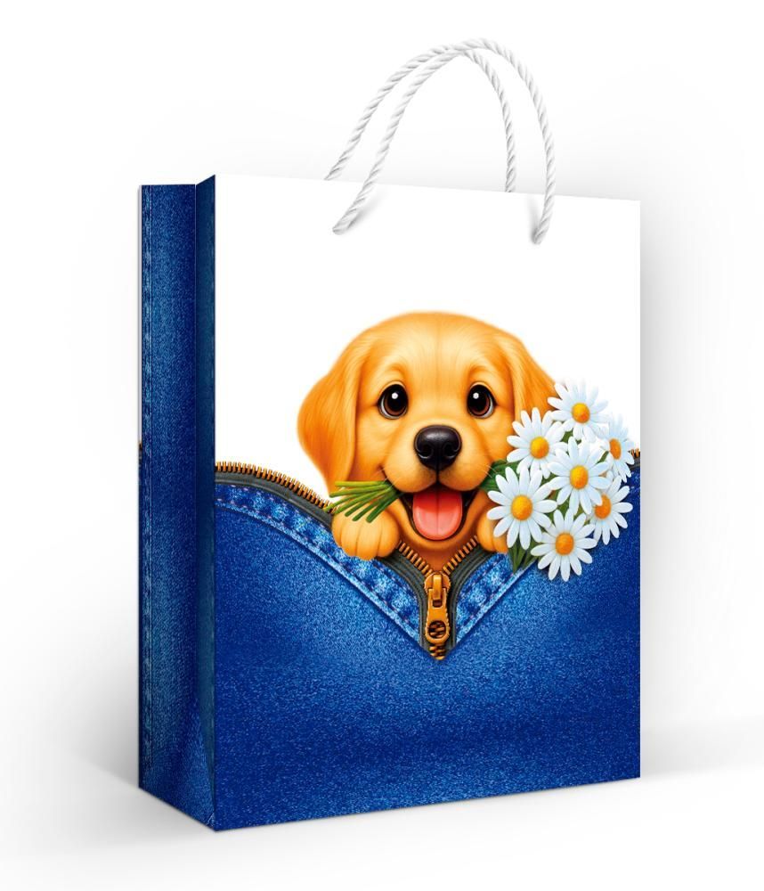 Пакет бумажный подарочный формата M изготовлен из плотной мелованной бумаги с матовой ламинацией, что обеспечивает устойчивость к истиранию, сохранение яркости печати и аккуратный внешний вид при транспортировке и хранении. Размер готового изделия 227 × 180 мм оптимален для упаковки средних по габаритам подарков, сувениров и сопутствующей продукции, в том числе в розничных магазинах, книжных, детских и подарочных отделах. Конструкция с плоским дном позволяет пакету устойчиво стоять на горизонтальной поверхности и упрощает механизированную или ручную укладку товара. Ручки-шнуры из синтетического материала надежно закреплены в верхней кромке, выдерживают типичную нагрузку для данного формата и удобны при переноске на небольшие расстояния, что важно при массовой выдаче покупок. Матовая ламинация дополнительно повышает жесткость стенок, защищает декоративный слой от влаги кратковременного воздействия и механических повреждений, а также препятствует выцветанию при витринной экспозиции. На лицевой стороне выполнено полноцветное изображение щенка с букетом ромашек на фоне джинсовой фактуры, что делает пакет универсальным решением для детских праздников, дней рождения, неформальных поздравлений и тематических акций; дизайн подходит для широкого круга получателей и может использоваться как элемент фирменного ассортимента сезонных или постоянных коллекций. Внутренняя поверхность без текста и дополнительных элементов, что удобно для оптовых покупателей, формирующих единый ассортимент без привязки к конкретному событию и использующих пакет как нейтральный носитель при различных рекламных и подарочных программах. Поставка осуществляется по 10 штук, что упрощает учет, складирование и планирование запасов, позволяет оптимально заполнять полочное пространство и транспортную упаковку без излишних остатков. Пакет подходит для использования в розничной продаже поштучно, в составе готовых подарочных наборов, а также для выдачи покупок как альтернативы обычным фасовочным пакетам, обеспечивая более презентабельное оформление товара.